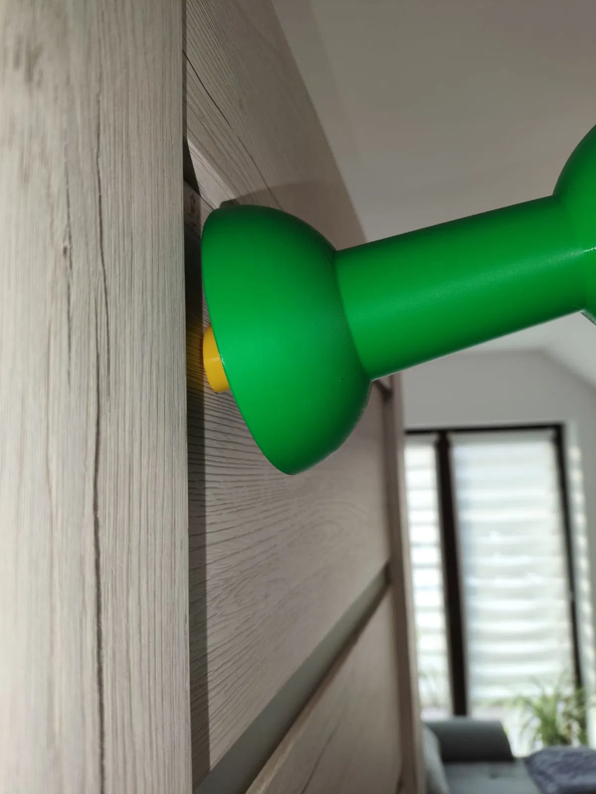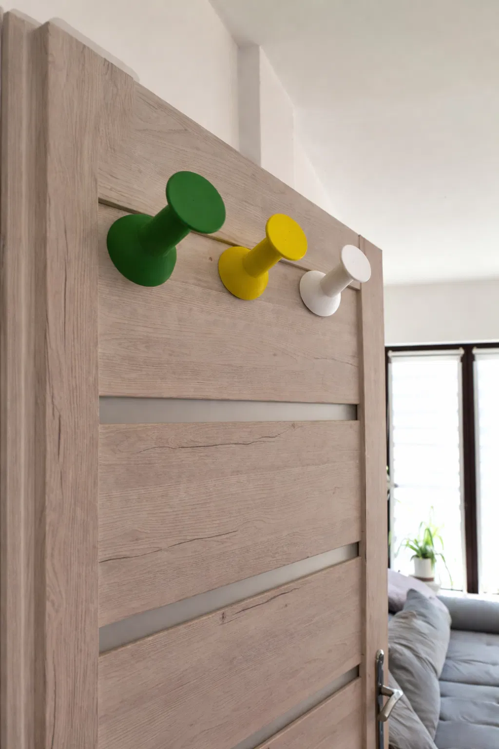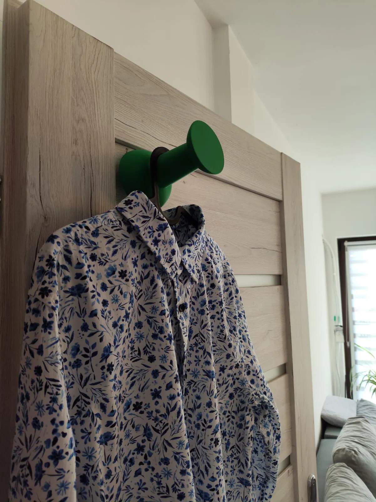 Móc treo quần áo dạng push pin, thiết kế in 2 phần với bệ bắt vít gắn lên cửa/tường. Móc nghiêng 10° để giữ đồ chắc hơn, lỗ vít vẫn vuông góc bề mặt. Treo tai nghe, khăn, balo…