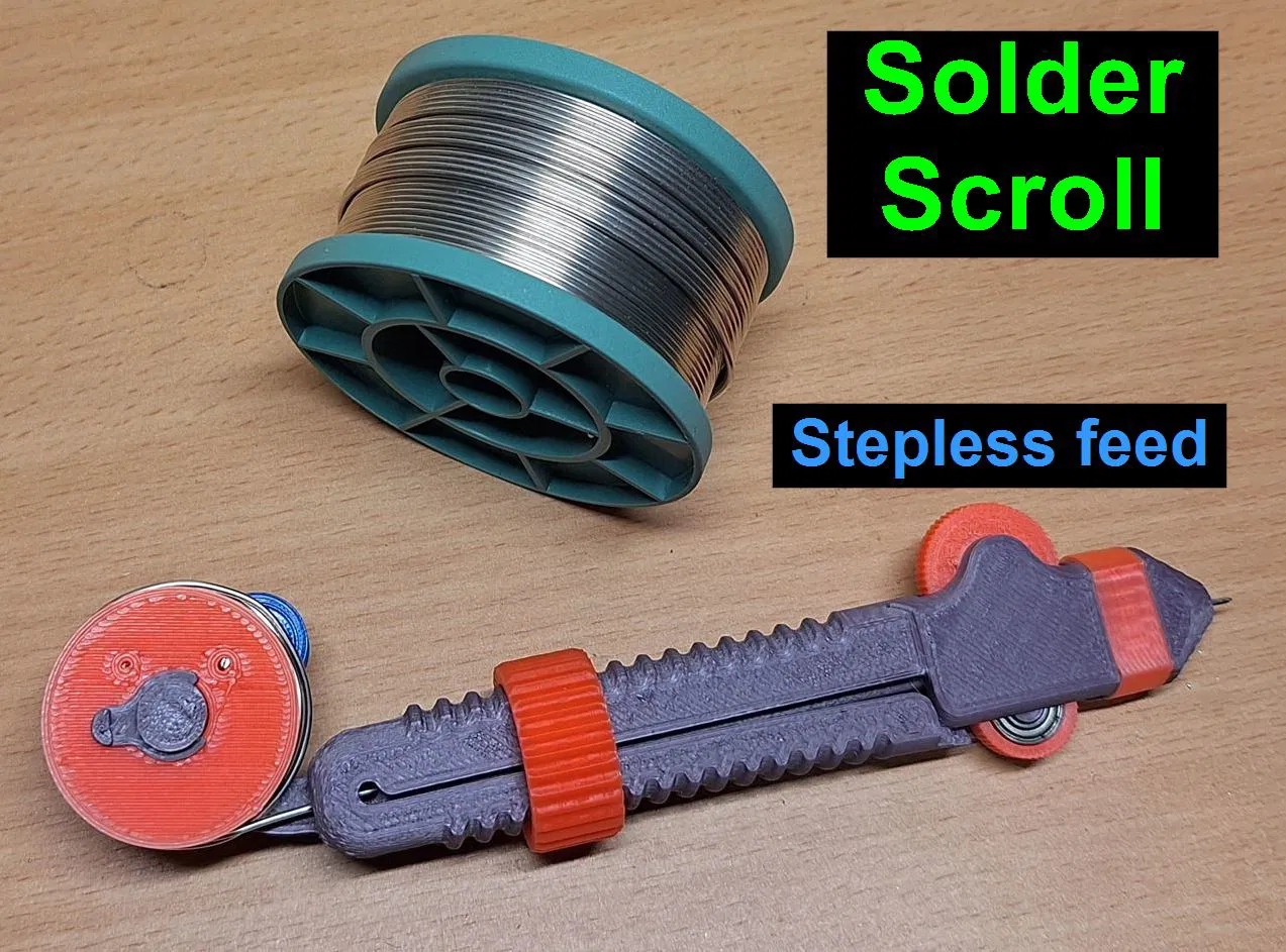 Bản Solder Scroll đã bỏ gears để tránh trượt, rollers được làm rộng hơn và roller nhỏ thêm bearing 5x11x5 (685 ZZ). Có bản LH/RH. Khuyến nghị in bearing bolt solid bằng PETG và tăng walls.