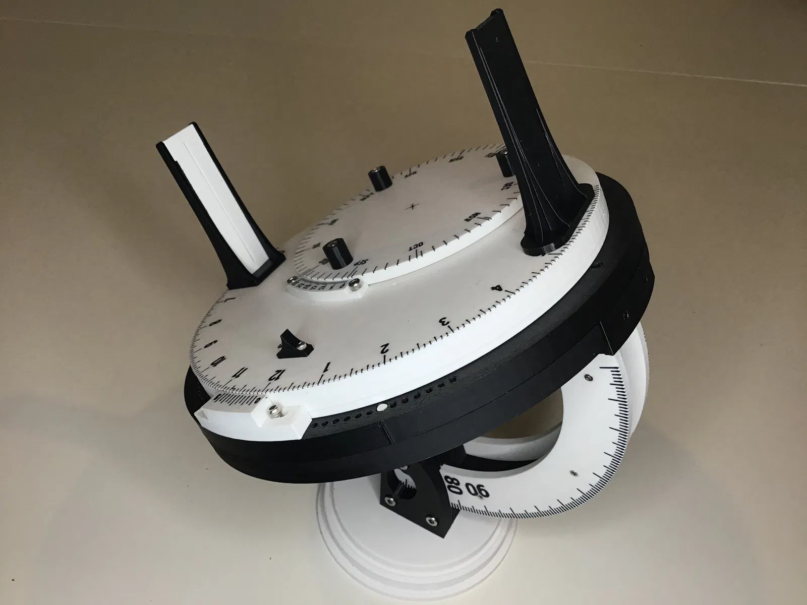 Chỉnh vĩ độ (Latitude Adjustment): Thông qua một cung chia góc (quadrant) ở đế để đặt đúng độ ngẩng của đĩa trên. Type-1 dùng bệ dạng bát (bowl mount), còn Type-5 là bệ dạng lưỡi liềm (crescent mount). Cả hai biến thể đều được cung cấp trong thiết kế này;