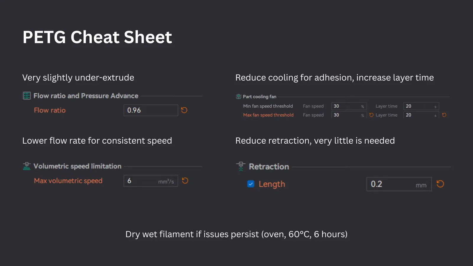 Vật liệu: PETG. Để tăng khả năng chịu ngoài trời, cân nhắc phủ sơn bảo vệ trong suốt chống UV. Nếu bạn bị delamination, quá nhiều stringing hoặc blobs, thử dùng các thông số sau: