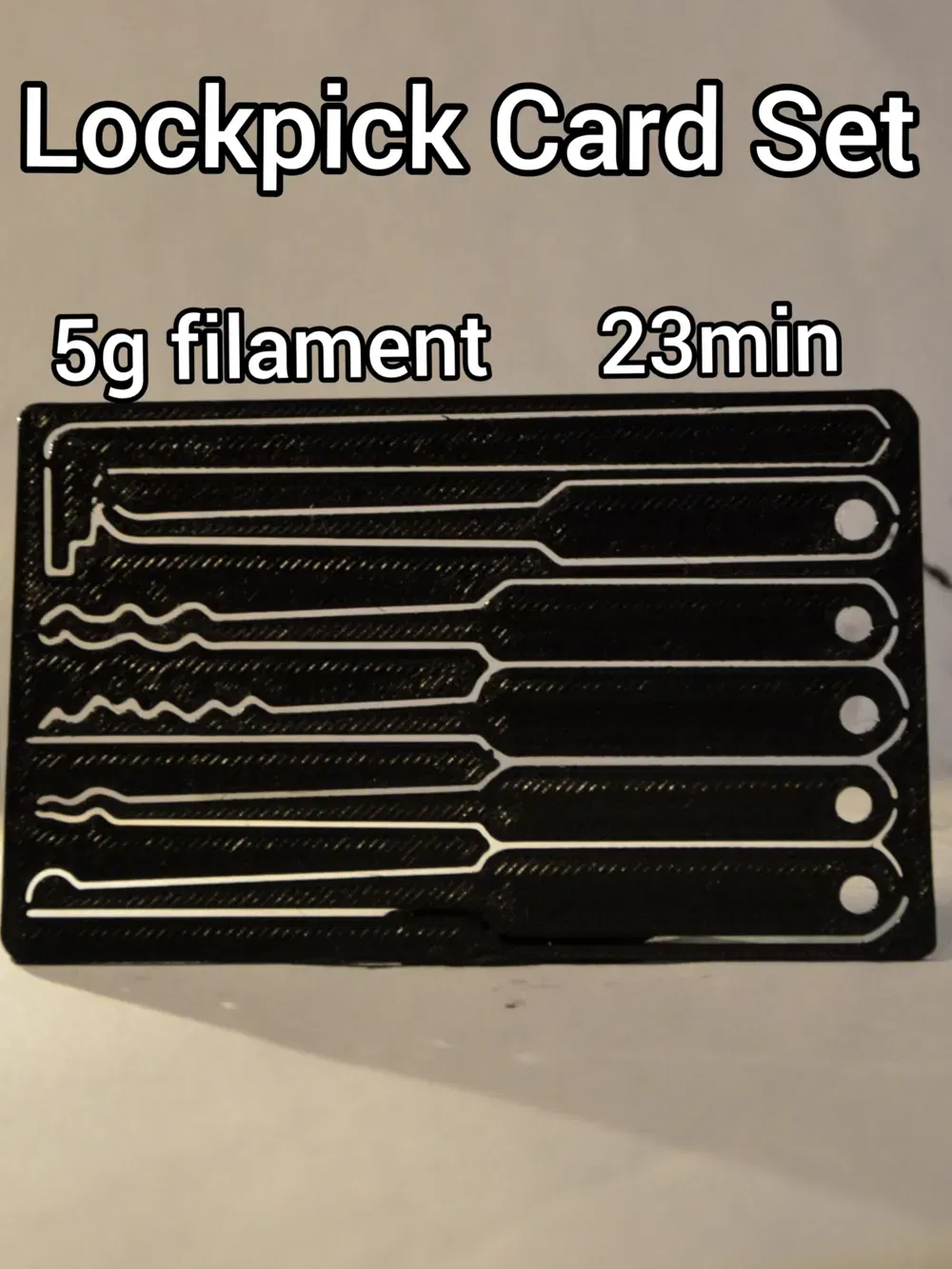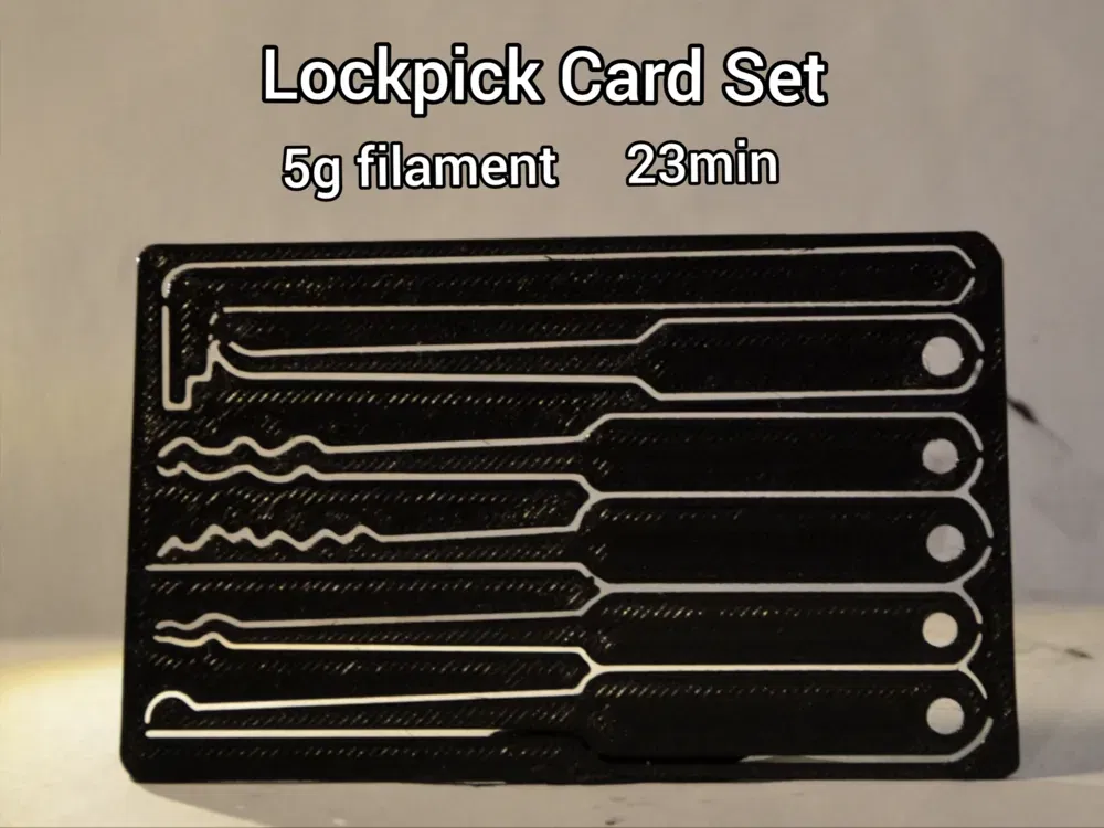 Bộ thẻ lockpick (Lockpick Card Set) tối ưu cho in 3D nhanh và tiết kiệm vật liệu. Thời gian in khoảng 23 phút, phù hợp khi cần in gấp và dùng ít filament.