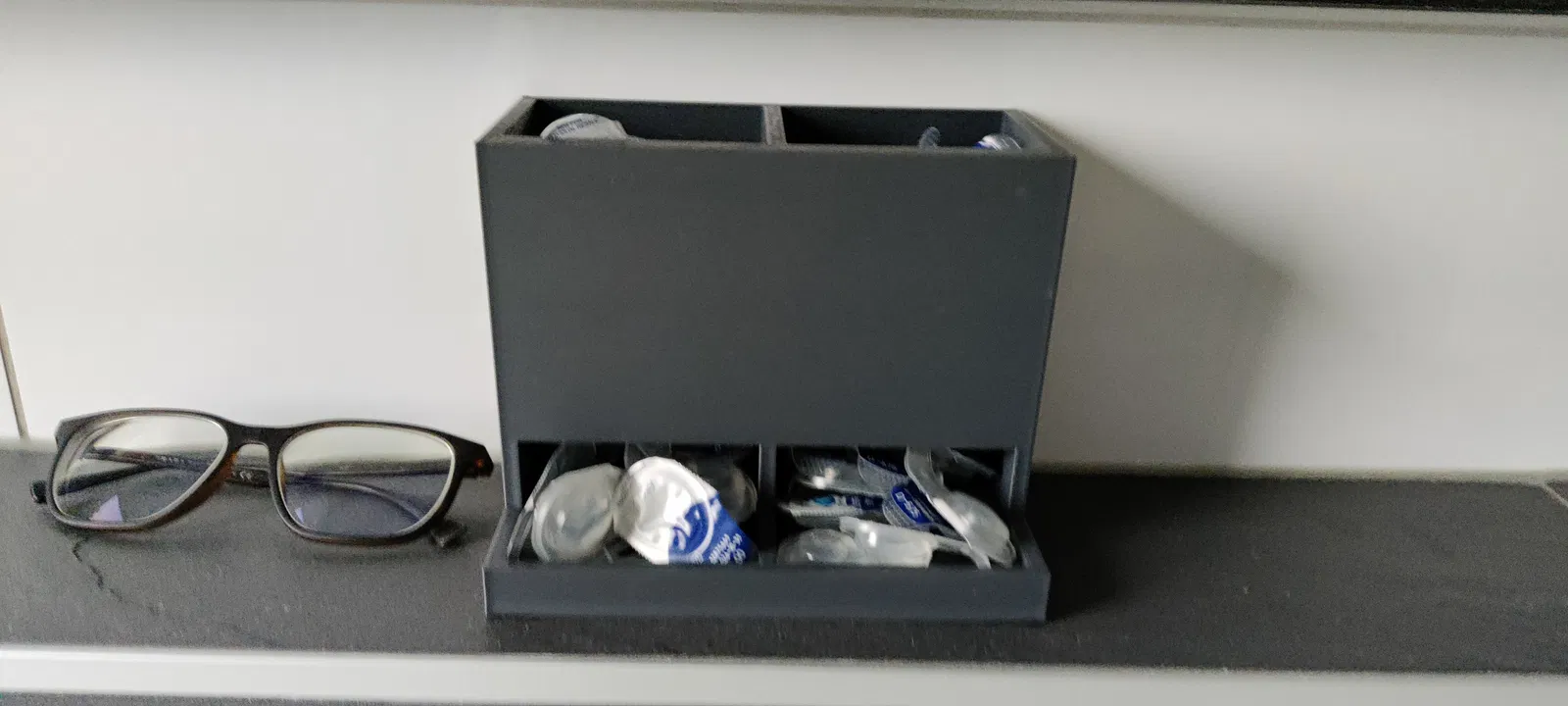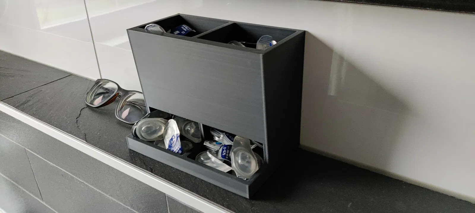 Hộp/khay sắp xếp kính áp tròng dùng hằng ngày cho phòng tắm, giúp tách riêng lens mắt phải và mắt trái. Bên trong có độ nghiêng nhỏ để lens trượt ra phía trước, dễ lấy đúng độ mỗi sáng.