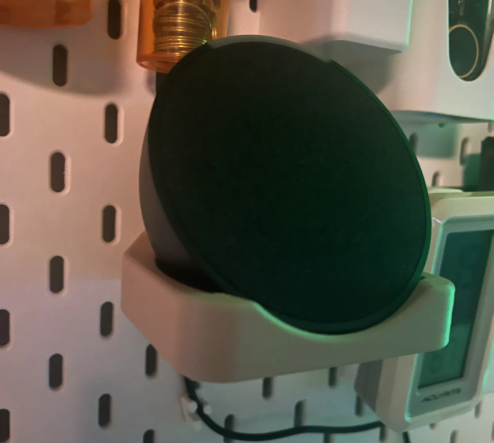 Ngàm gắn tương thích IKEA SKÅDIS dành cho Amazon Alexa Echo Pop (V1), giúp treo loa chắc chắn lên pegboard để gọn mặt bàn mà vẫn giữ âm thanh rõ và micro không bị che. Tối ưu cho in 3D, hỗ trợ bắt buộc.
