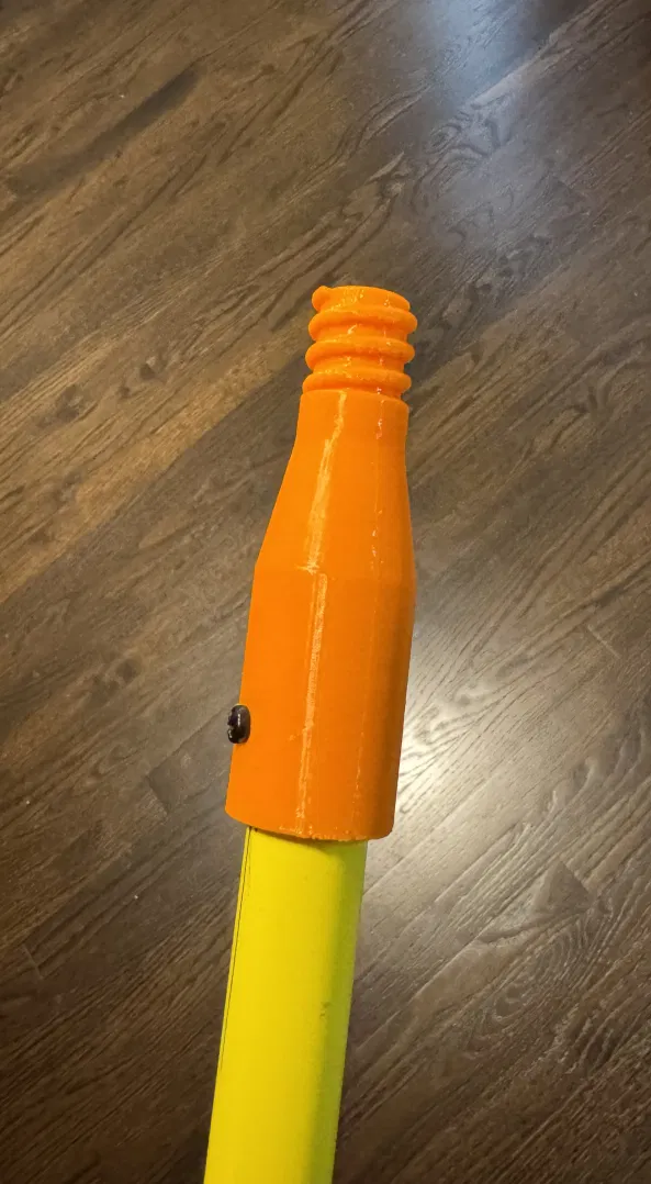 Part thay thế cho cây snow broom cán dài: gắn vào cán và vặn vào đầu chổi. Tác giả in PETG đặt nghiêng 45° để tăng độ bền, đồng thời in thêm vài cái dự phòng. Có thể hợp với nhiều hãng khác.