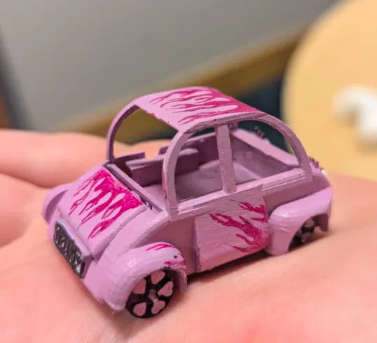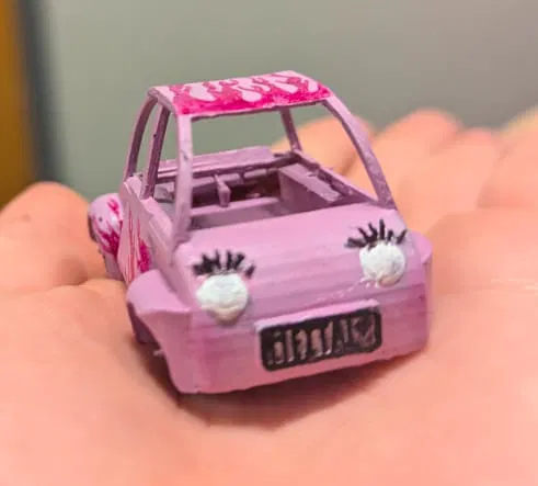 Mẫu xe Volkswagen Beetle nhỏ xinh có lông mi dễ thương, bánh xe hoạt động được. Cần lắp ráp và tô màu; có thể phải chà nhám nhẹ các rod để bánh xe quay mượt tùy máy in.