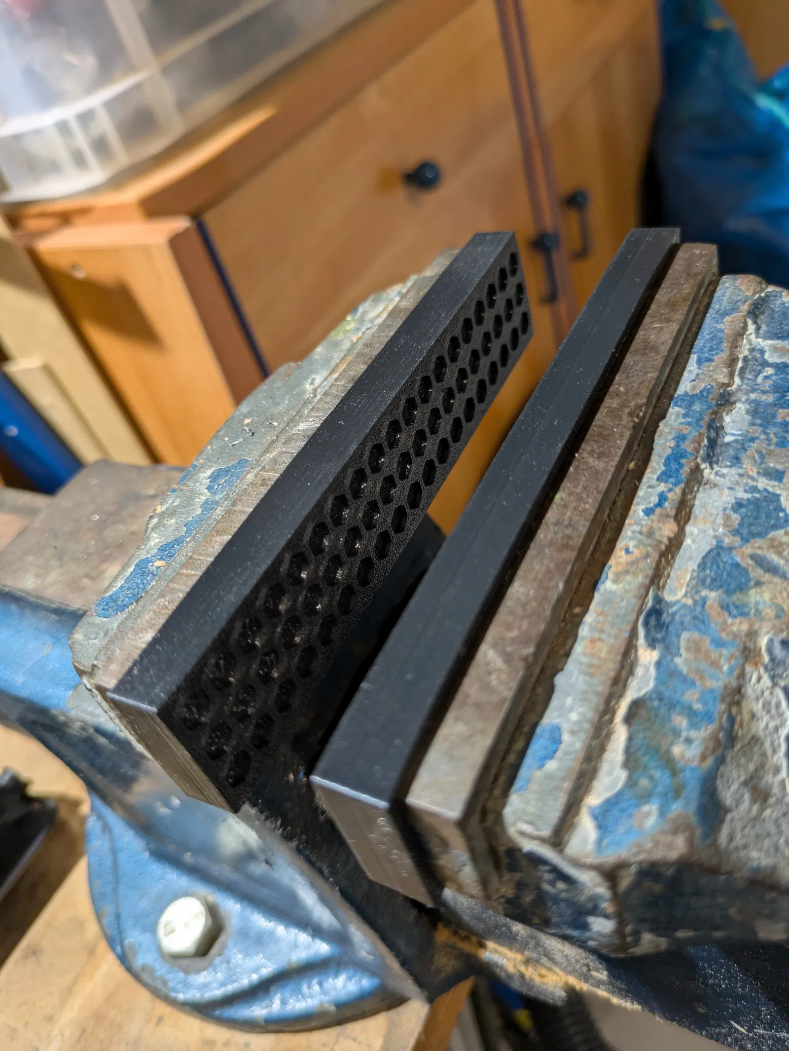 Bộ soft jaws cho bench vise in bằng TPU (98A) giúp kẹp đồ nhạy cảm mà không trầy xước hay móp méo. Thiết kế dạng ốp đơn giản, có họa tiết lục giác phía trước và có thể scale theo ê-tô của bạn.