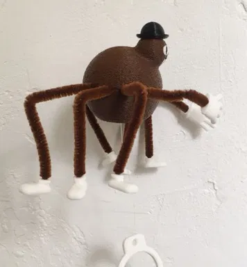 Phần tay được chỉnh sửa từ mẫu Cartoon Right Hand của nickydubya - https://www.thingiverse.com/thing:7004605. Cũng có bản tay trái nữa, nhưng tới lúc mình thu nhỏ và mirror từ tay phải xong rồi mới phát hiện ra. Mình cũng trám phần rỗng ở dưới đáy bàn tay và khoét một lỗ để luồn pipe cleaners. Tất cả các phần còn lại của con nhện là do mình tự thiết kế. Ban đầu mình định in phần thân màu đen, nhưng mình tìm thấy vài cọng pipe cleaners lông xù màu nâu từ một dự án cũ lâu rồi, nên mình in màu nâu luôn. Mình in hai phần thân với chế độ fuzzy skin. Cái vành (flange) quanh nửa thân dưới được chặn lại để in cho mịn. Cắt, uốn và tỉa pipe cleaners sao cho không bị vướng vào cơ cấu chuyển động.