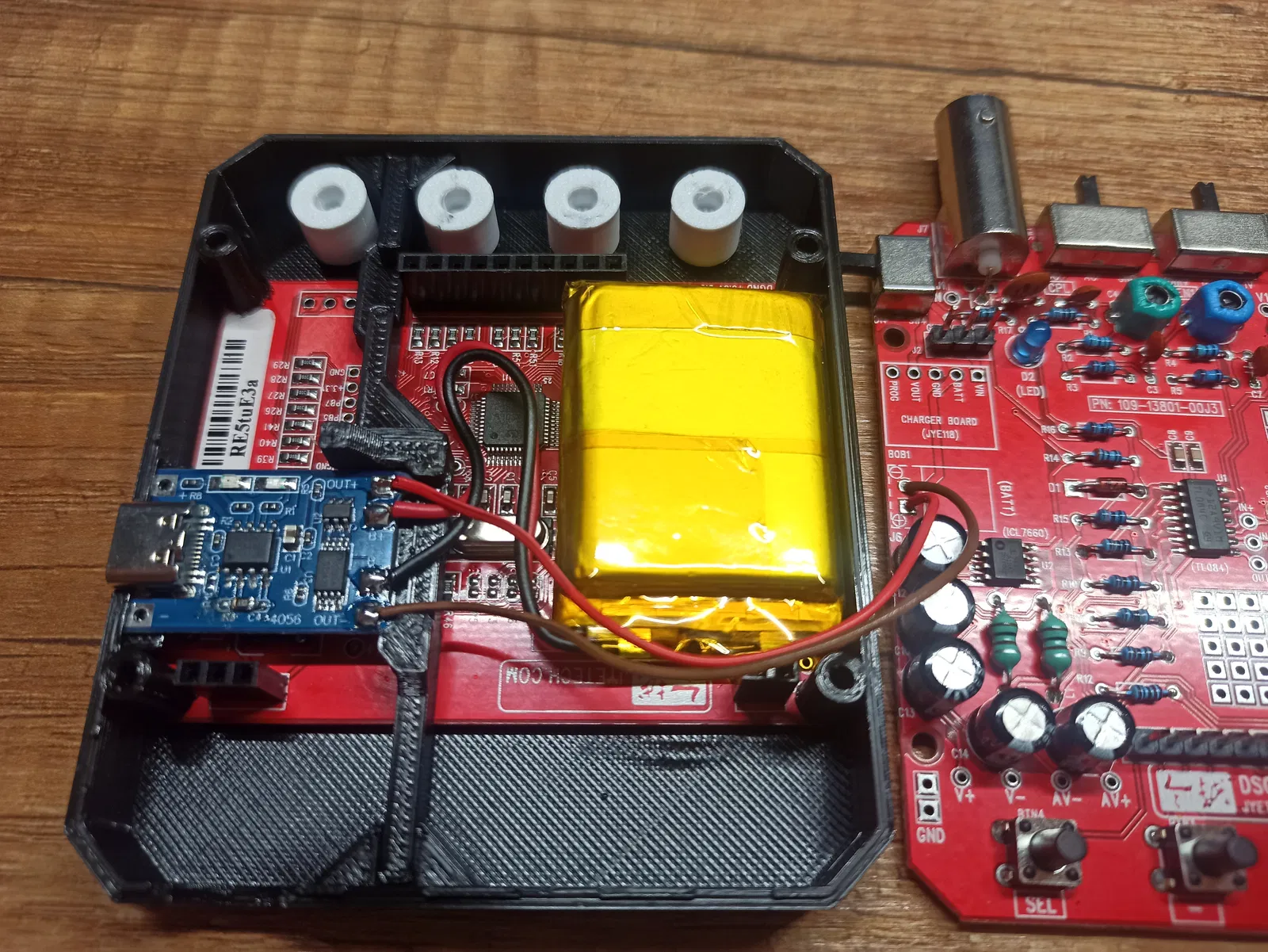 Khi lắp, trước tiên đặt nửa trên của board (có màn hình) vào phần in phía trên, bắt vít cố định lại; đặt “Board Holder” kèm module sạc vào bên trong như trong hình rồi úp phần dưới của DS138 vào; cuối cùng đậy nốt phần đáy còn lại và bắt vít siết chặt toàn bộ.