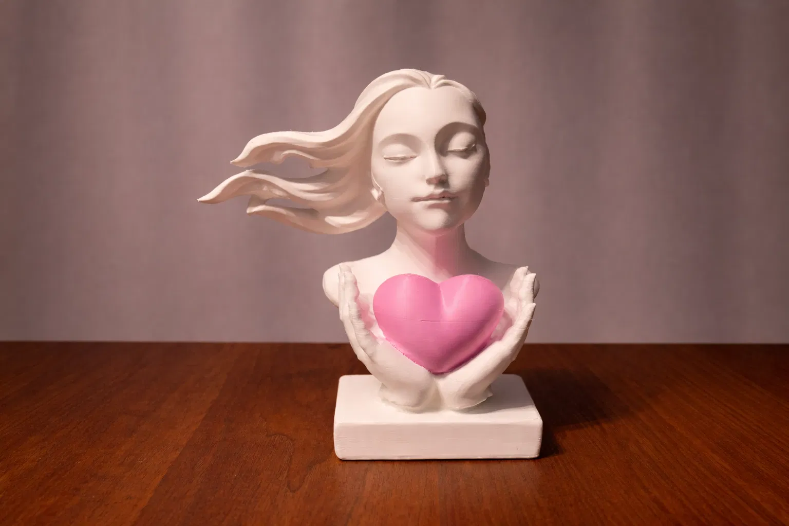 Một tác phẩm điêu khắc màu trắng khắc họa người phụ nữ với nét mặt yên bình, đang ôm một trái tim, đặt trên bề mặt gỗ trước phông nền mềm mại, trung tính.