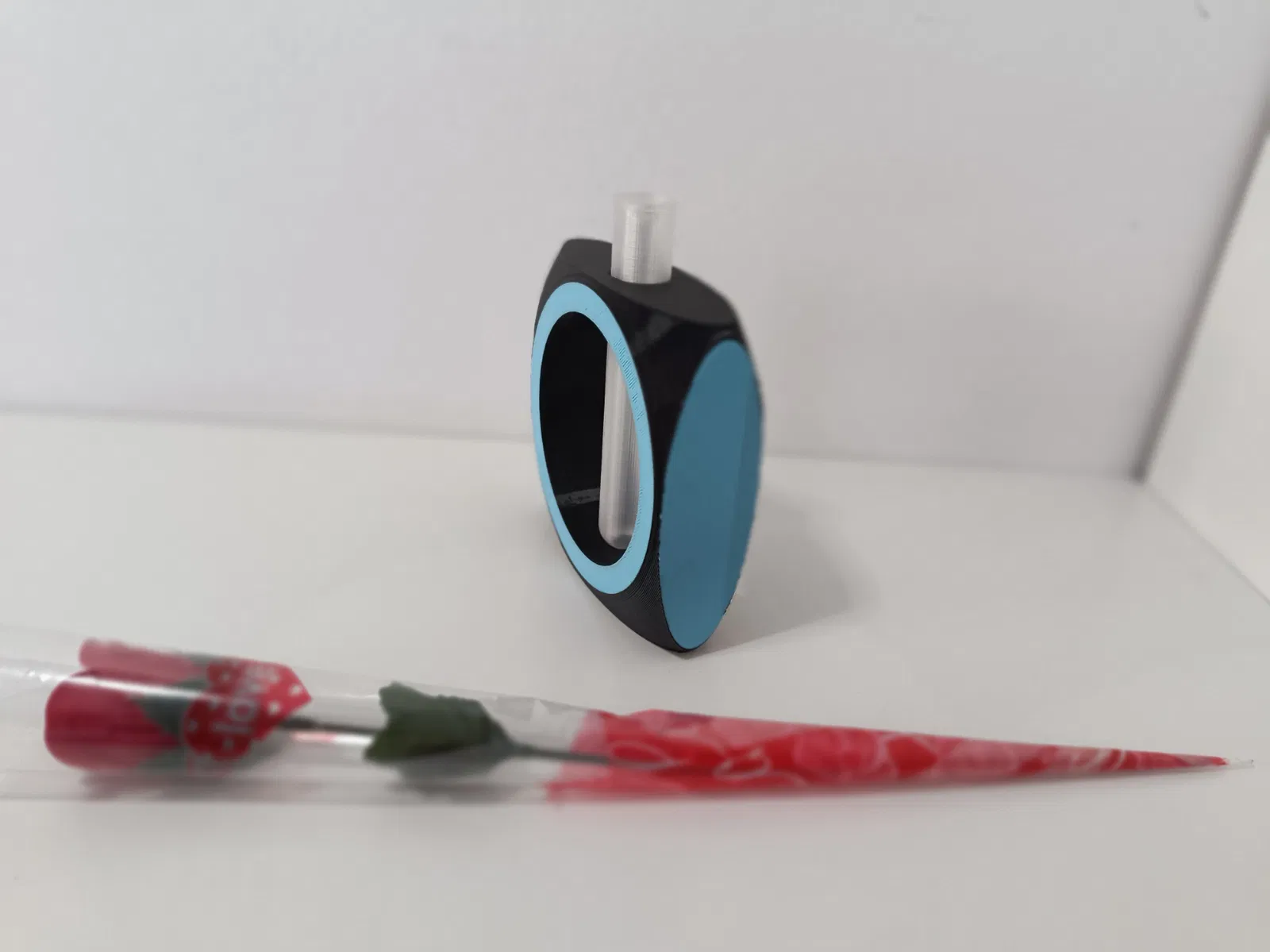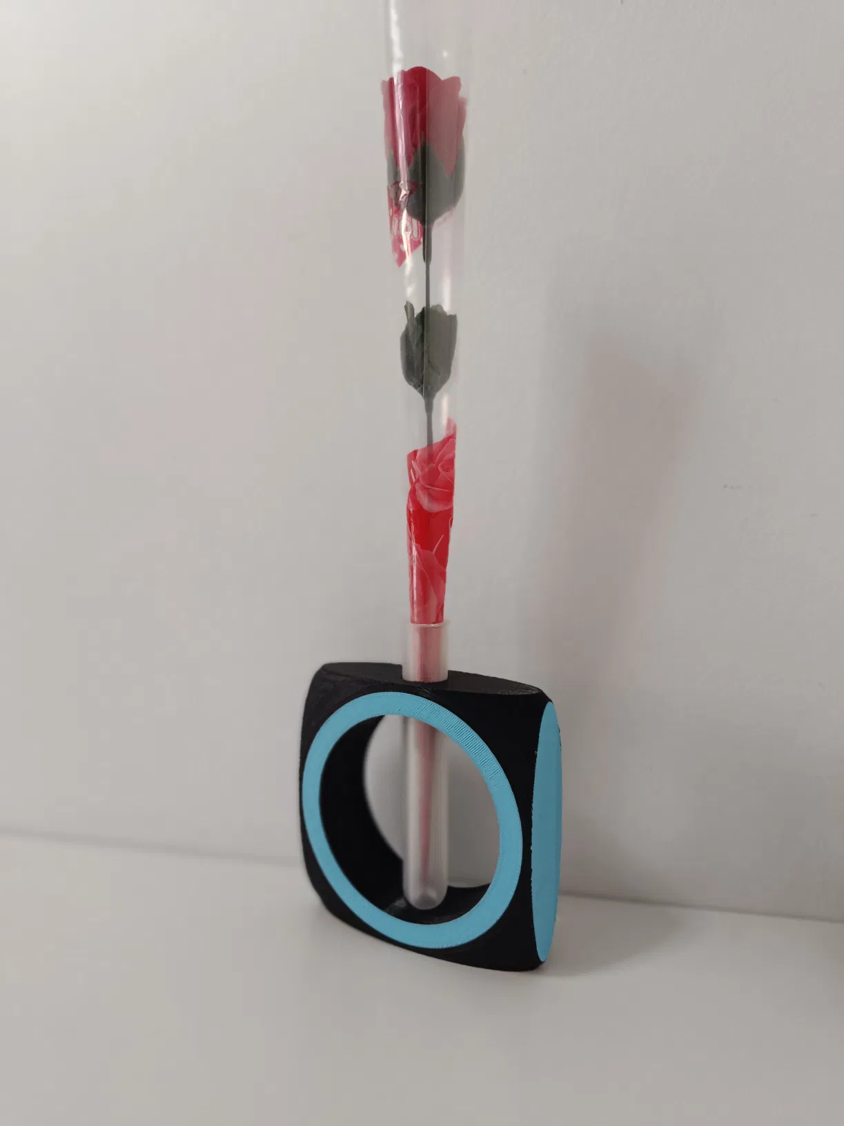 Chỉ cần luồn ống nghiệm (test tube) vào khe ở phần trên của khối, rồi cắm bông hoa bạn thích vào trong ống là xong.