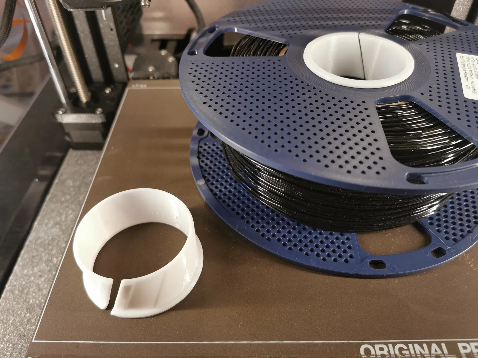 Các cuộn filament tái sử dụng mới của SUNLU (~lỗ giữa 55mm, có thể tháo rời các phần để nạp lại filament đã quấn) có đường kính hơi khác nhau ở phía trái và phải.