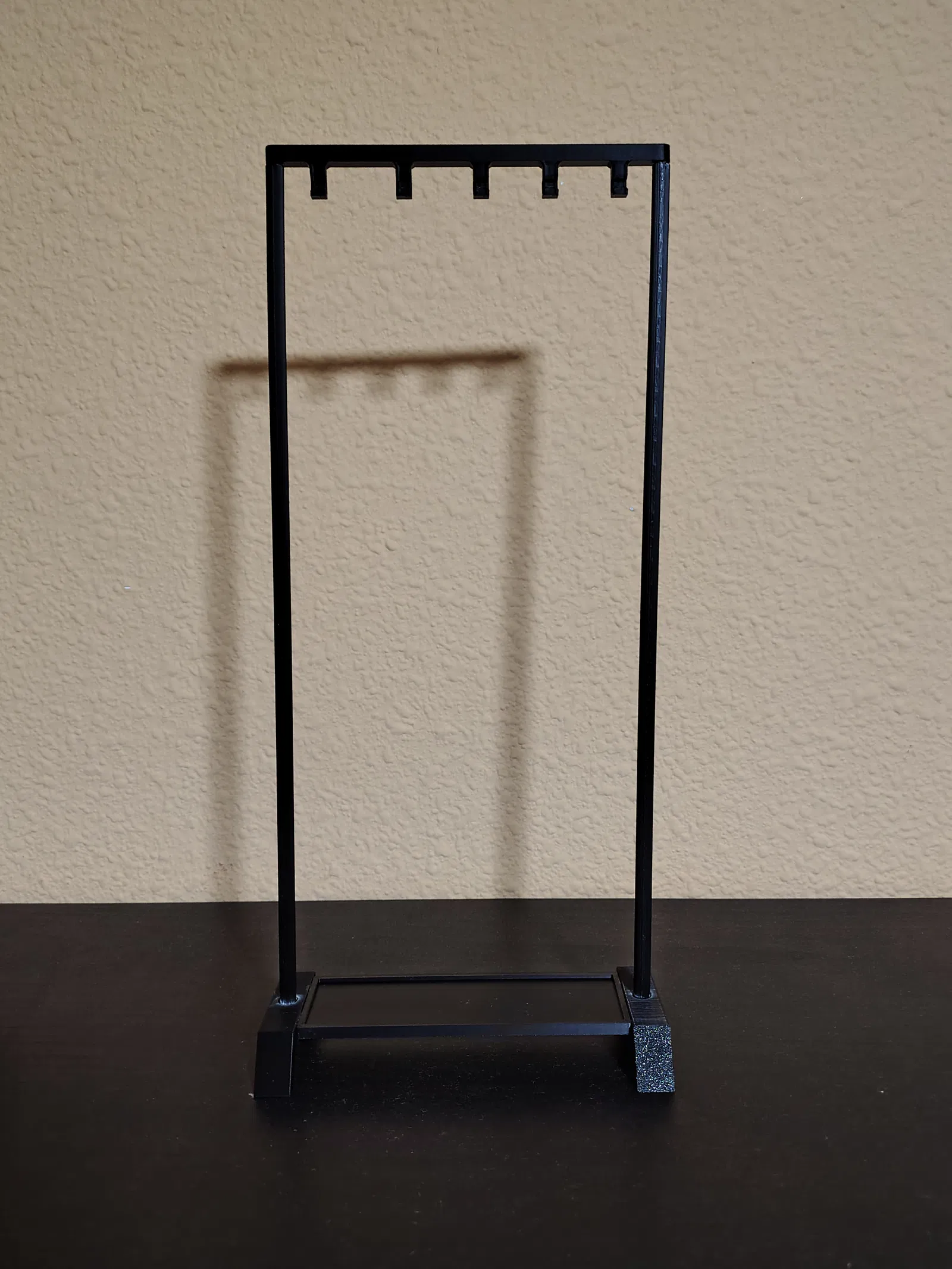 Giá treo cọ Trung Quốc có khay hứng nhỏ giọt; đã bổ sung móc thứ 5 và sắp xếp giãn cách các móc để phù hợp với cọ dày hơn ở bên trái và cọ mỏng hơn ở bên phải.
