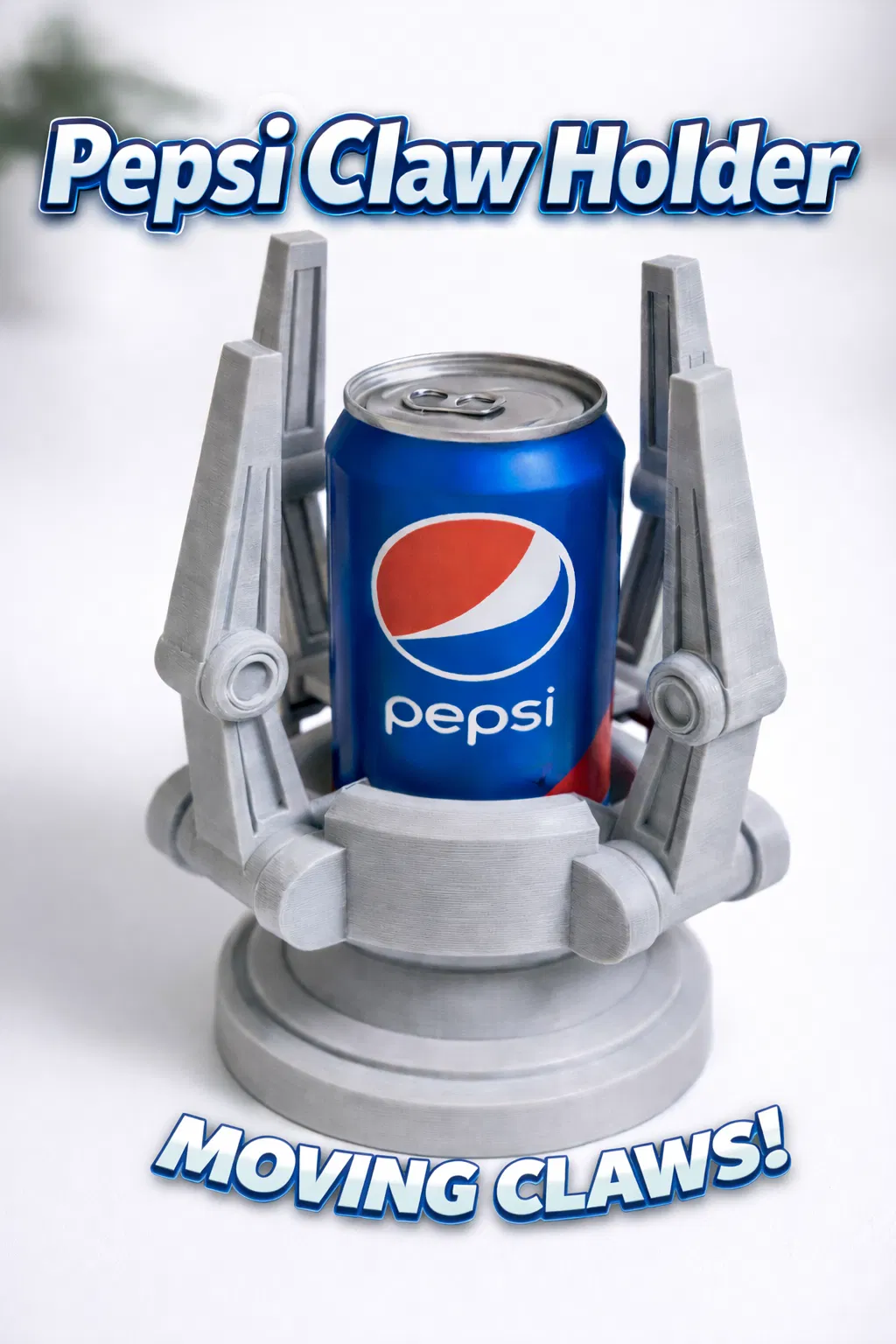 Giá đỡ lon Pepsi dạng móng kẹp có các càng/móng chuyển động, ôm chắc lon nước ngọt tiêu chuẩn. In 3D hoàn toàn, chắc chắn, đẹp mắt, không cần phần cứng thêm—hợp để bàn làm việc hoặc trưng bày.