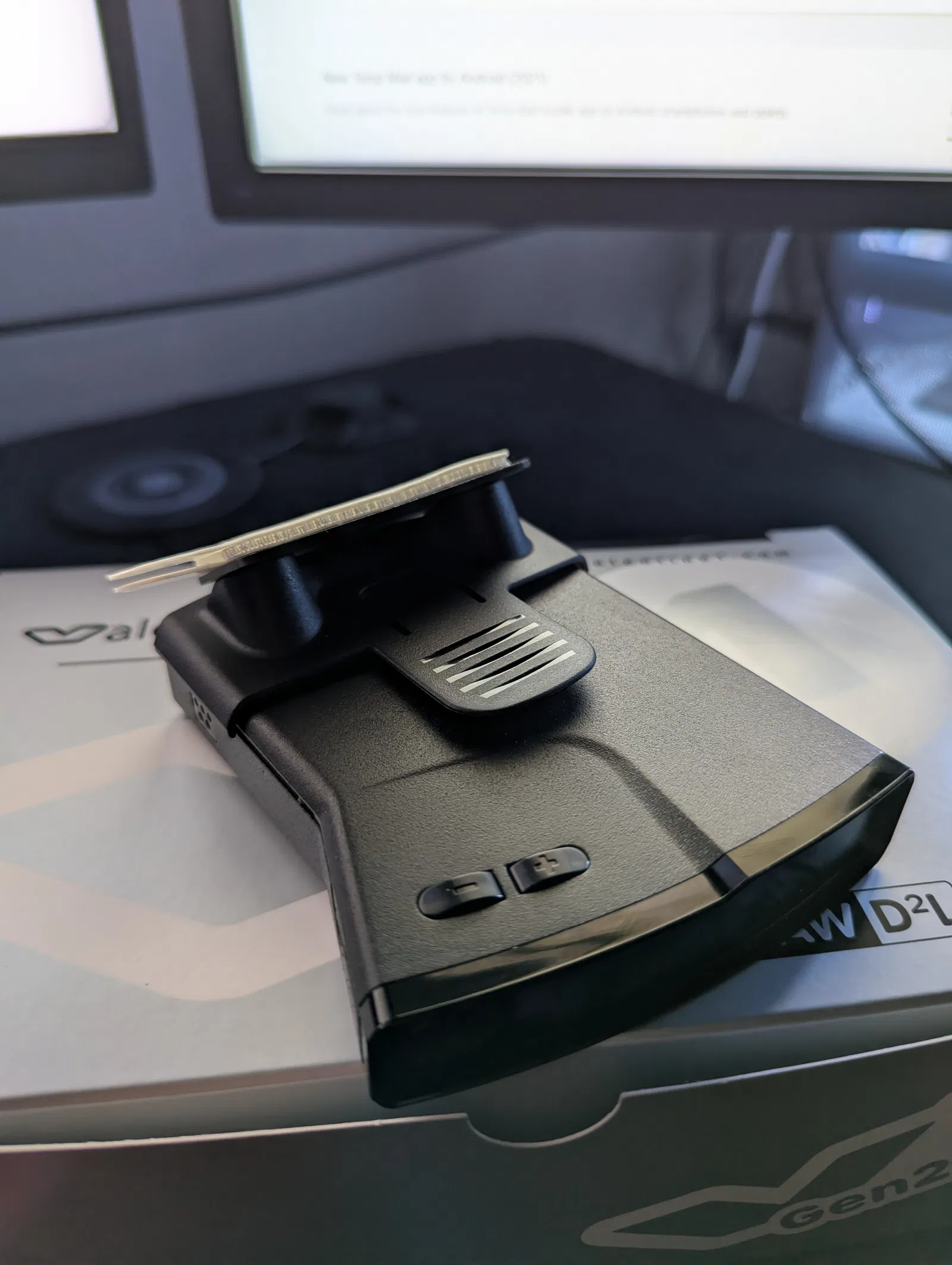 Tấm plate thay giác hút để gắn Valentine V1 Gen 2 lên kính chắn gió Mustang S550. Dùng kẹp zin của V1 Gen 2, tạo bề mặt phẳng để dán bằng 3M Dual Lock hoặc 3M VHB. Có file Part/STEP/STL.