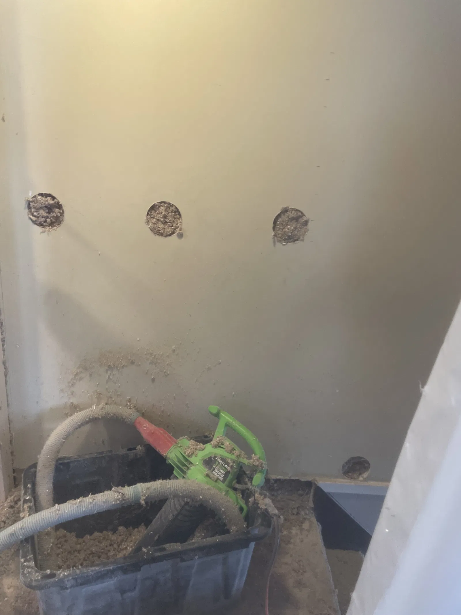 Có điều là bạn phải làm tơi/bẻ nhỏ insulation trước. Mình dùng dụng cụ trộn bùn (mud mixing tool) và paddle adapter để làm nhanh gọn. Mình bẻ insulation trong một thùng tote 27-gallon. Sau đó đặt phần vacuum của leaf blower vào đống insulation đã làm tơi và bật máy sau khi đã đưa ống vào trong tường. Bạn sẽ cảm nhận được áp lực ngược (back pressure) khi đẩy insulation về phía cửa hút vacuum. Nếu bị nghẹt, bạn sẽ thấy luồng gió đổi chiều và phụt ngược lại qua máy. Có thể làm dơ hơi nhiều, nhưng tập một chút là tránh được.