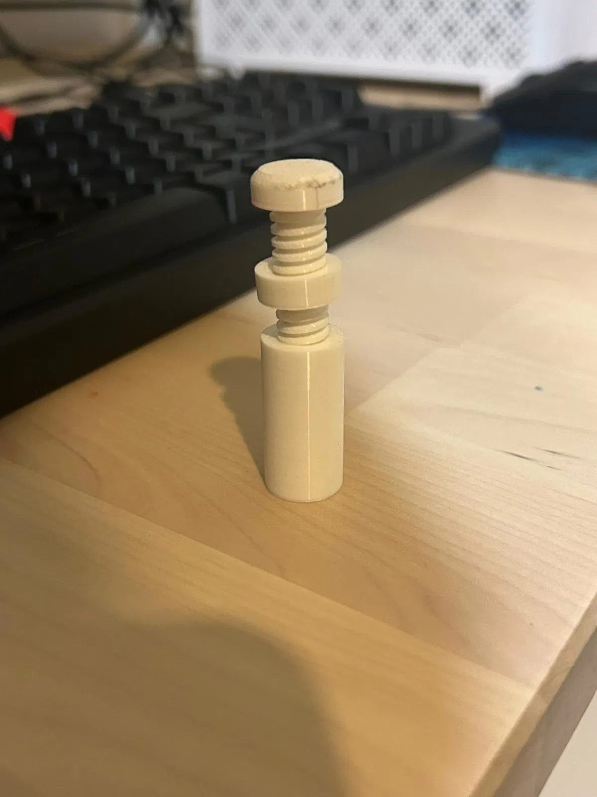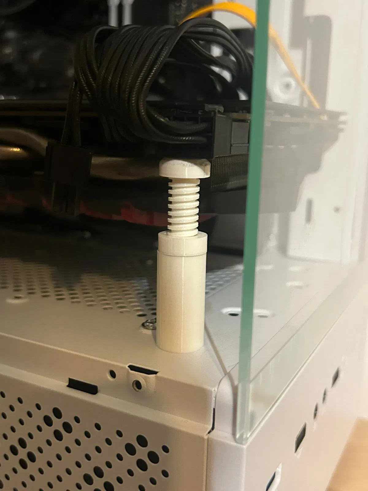 Mẫu giá đỡ card đồ họa điều chỉnh được, gồm 3 phần: trụ chính, vòng đệm và vít. Chiều cao tối thiểu 4 cm, tối đa 6,3 cm. Lắp bằng cách vặn vòng đệm vào vít rồi vặn vào trụ, chỉnh cao và siết cố định.