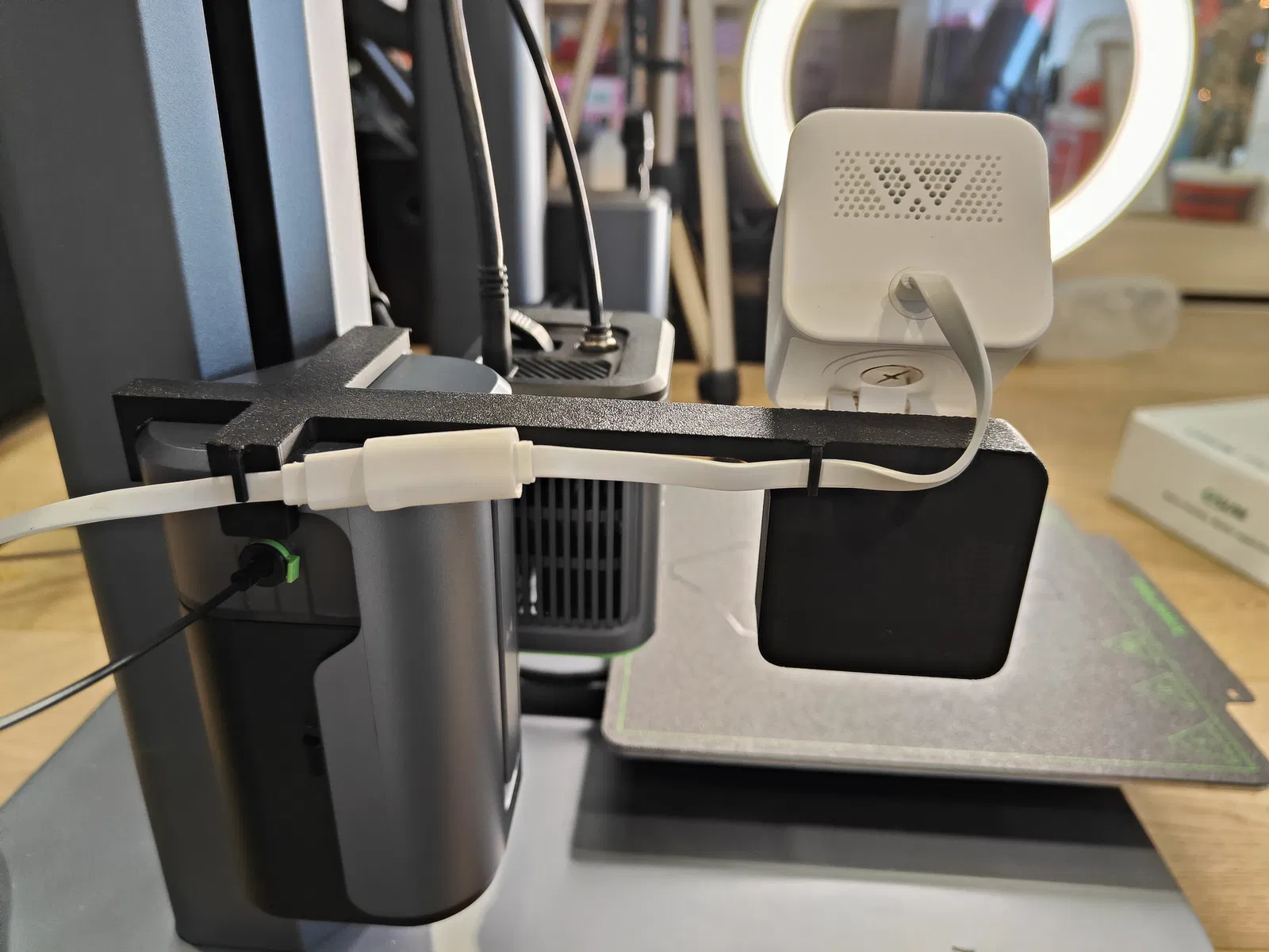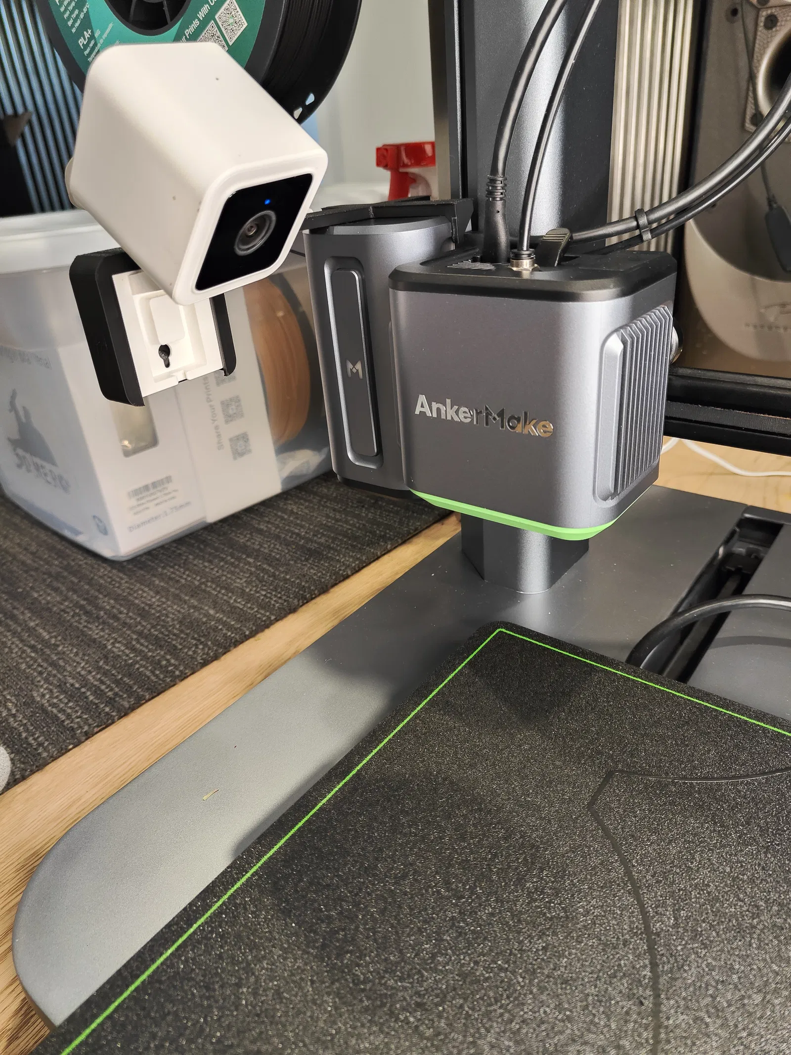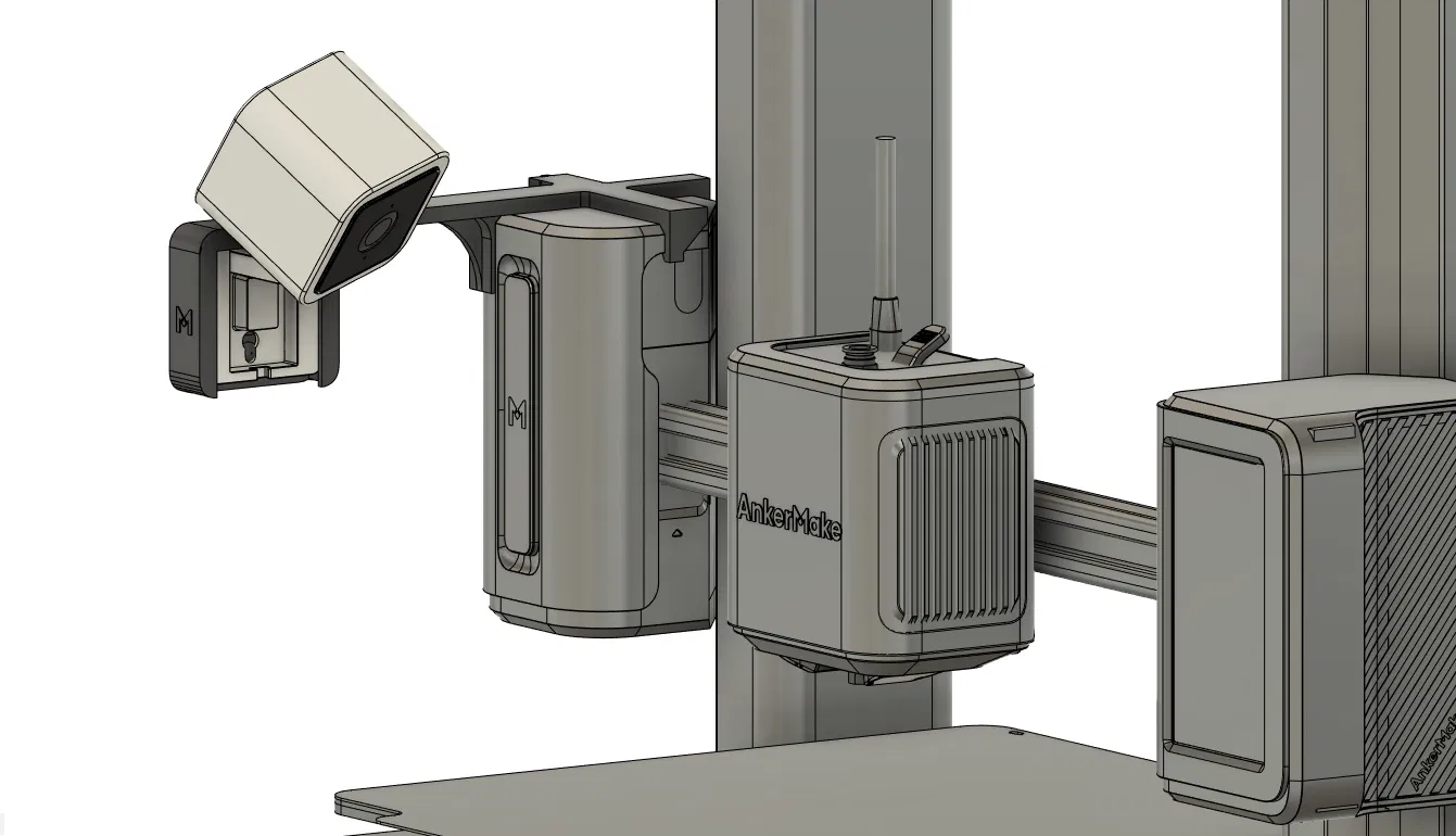Giá đỡ camera Wyze Cam v3 (hoặc v3 pro) gắn trên thanh dẫn hướng bên trái của máy in AnkerMake M5. Giúp quan sát bản in từ góc nhìn cao, bao quát hơn, đặc biệt hữu ích để theo dõi các lớp in đầu tiên.