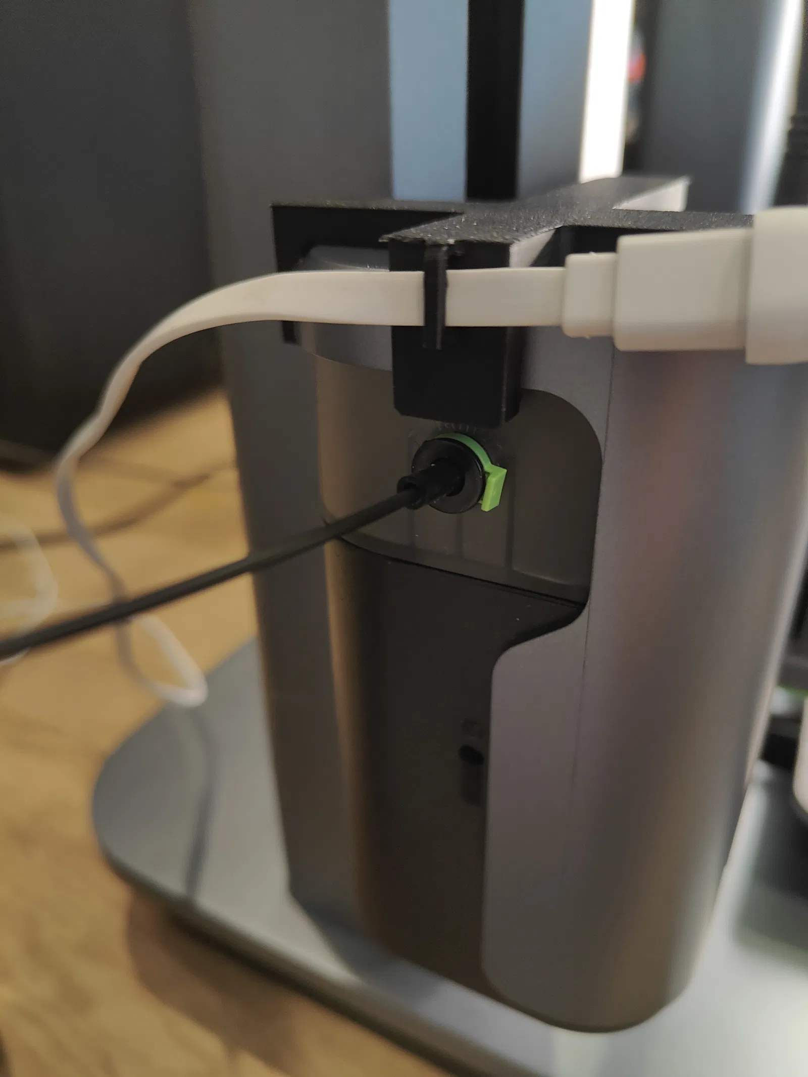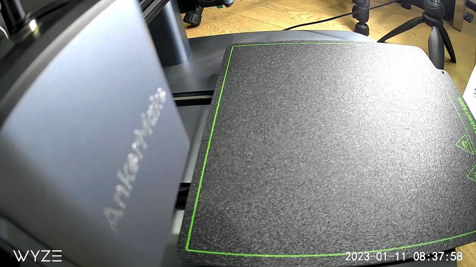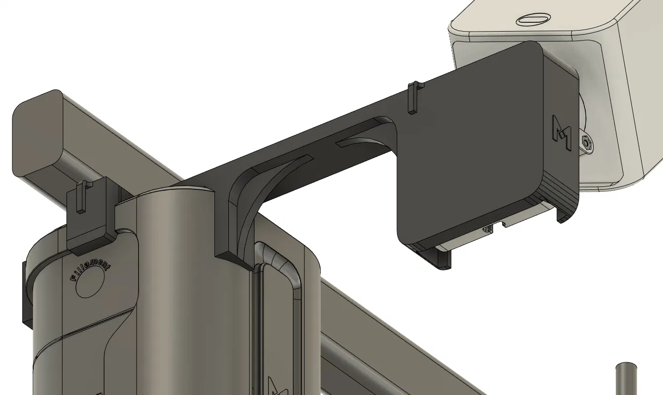 Giá đỡ camera Wyze Cam v3 (hoặc v3 pro) gắn trên thanh dẫn hướng bên trái của máy in AnkerMake M5. Giúp quan sát bản in từ góc nhìn cao, bao quát hơn, đặc biệt hữu ích để theo dõi các lớp in đầu tiên.