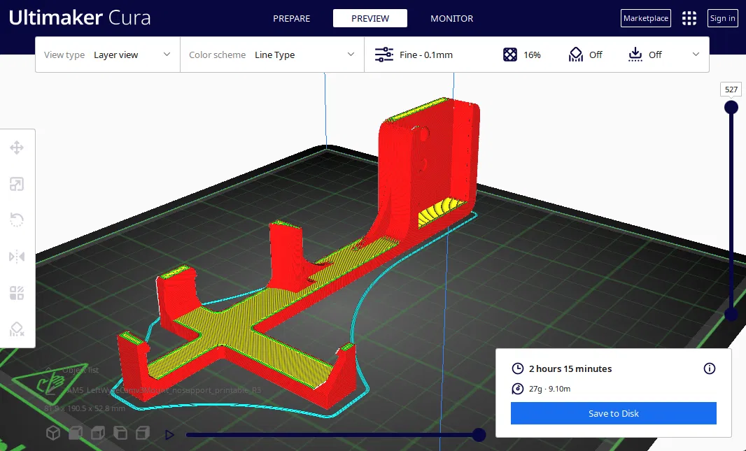 • Thời gian in khoảng 2 giờ với độ cao lớp 0.1mm, tốc độ 250mm/s và 15% độ đặc ruột (có file gcode cho PLA+)
