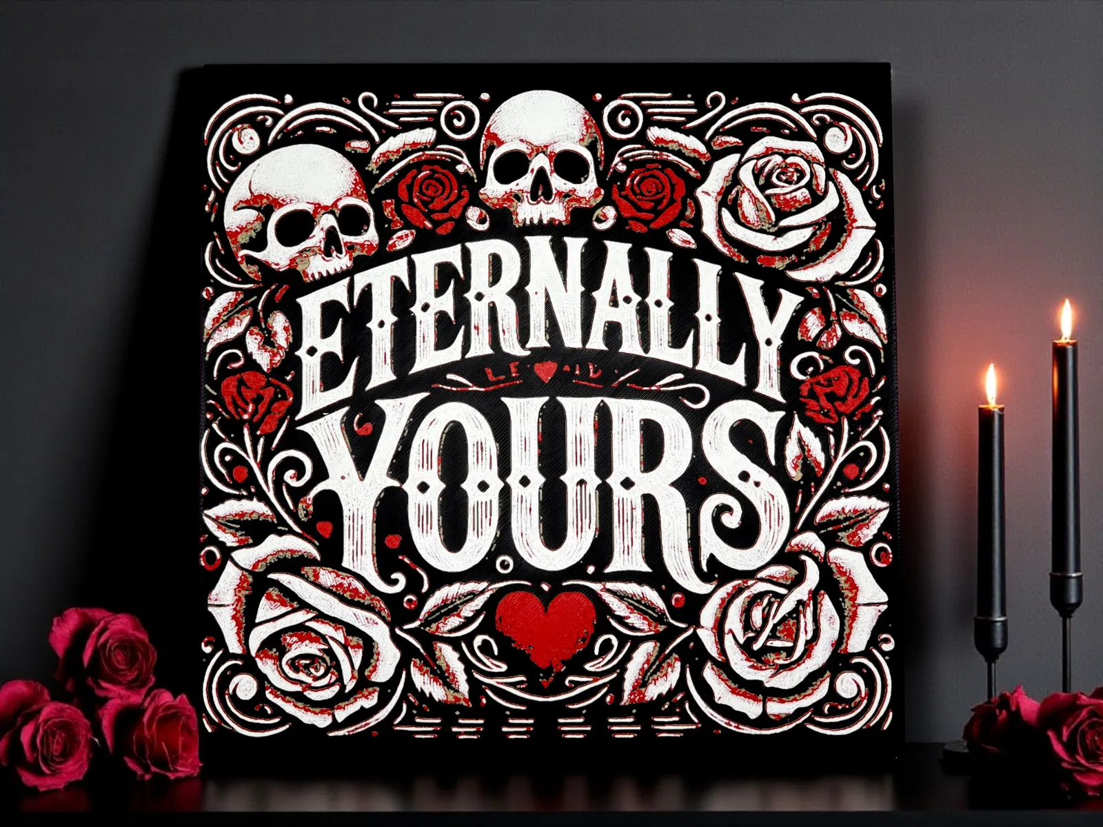 Tác phẩm ấn tượng này nổi bật với câu chữ “Eternally Yours” được thể hiện bằng kiểu lettering cầu kỳ, gợi phong cách vintage, bao quanh bởi đầu lâu chi tiết, hoa hồng đỏ thẫm và các họa tiết baroque uốn lượn. Bảng màu tương phản cao gồm đen, ngà và đỏ máu tạo hiệu ứng thị giác mạnh, cân bằng giữa biểu tượng u ám và chất lãng mạn vượt thời gian. Vừa gothic vừa đầy cảm xúc, thiết kế này rất hợp để trang trí Valentine theo phong cách alternative, sưu tầm dark romantic, hoặc làm artwork “điểm nhấn” tôn vinh tình yêu khác biệt.
