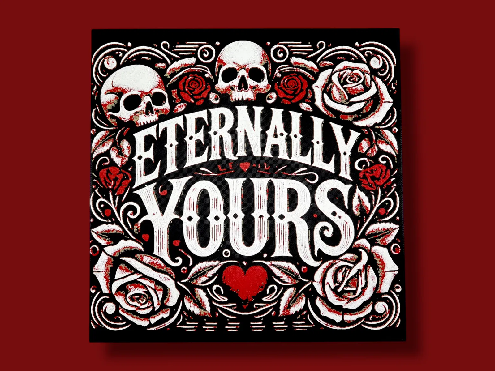 Thiết kế Hueforge Valentine đậm chất gothic với chữ “Eternally Yours”, đầu lâu và hoa hồng đỏ. Tông đen–ngà–đỏ tương phản mạnh, vừa u ám vừa lãng mạn, hợp làm décor Valentine alternative hoặc tranh trang trí nổi bật.