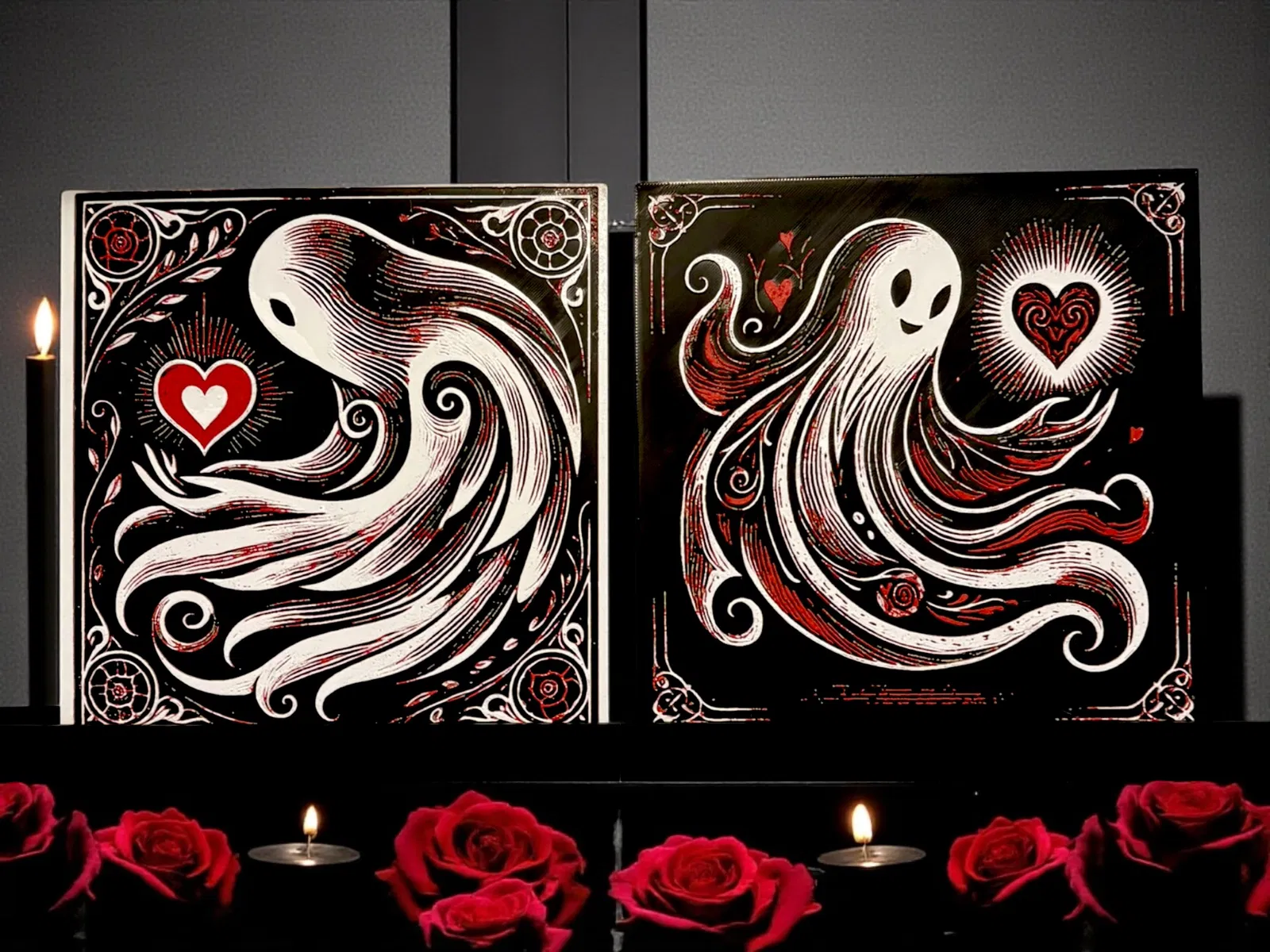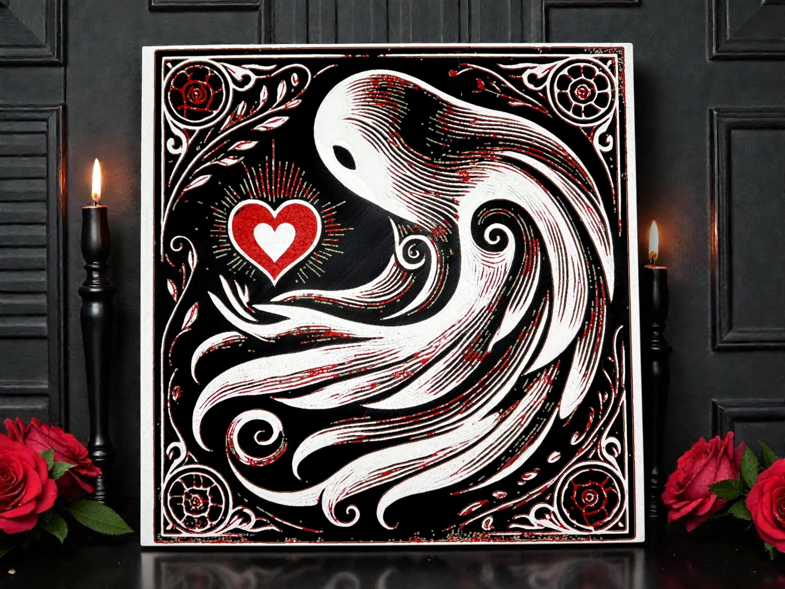 Tác phẩm mang màu sắc siêu thực này khắc họa một bóng ma mềm mại đang vươn tay về phía một trái tim rực sáng, được viền khung bằng những họa tiết trang trí cổ điển cầu kỳ. Tương phản giữa đen sâu, trắng ngà như xương và đỏ thắm nổi bật tạo cảm giác khát khao lặng lẽ—vừa lãng mạn, vừa man mác buồn, lại vượt thời gian. Vừa rờn rợn vừa dịu dàng, mẫu này bắt được tinh thần của tình yêu: nhẹ nhàng, khó nắm bắt, nhưng vẫn bền bỉ vượt khỏi hình hài—rất hợp để bổ sung cho bộ sưu tập gothic romance và “dark Valentine”.