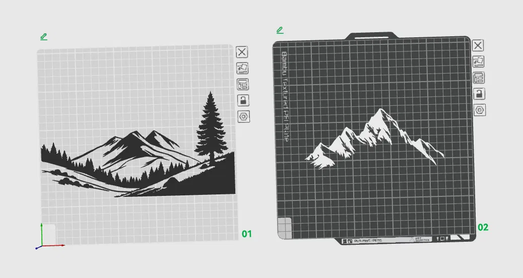 Snowy Mountains - No AMS là mẫu trang trí tường phong cảnh núi mùa đông, thiết kế lớp màu đơn giản, nhìn tinh tế và nhẹ nhàng. In 2 plates (Forest + Snowy peaks) nên không cần AMS; có AMS thì có thể in 1 lần.
