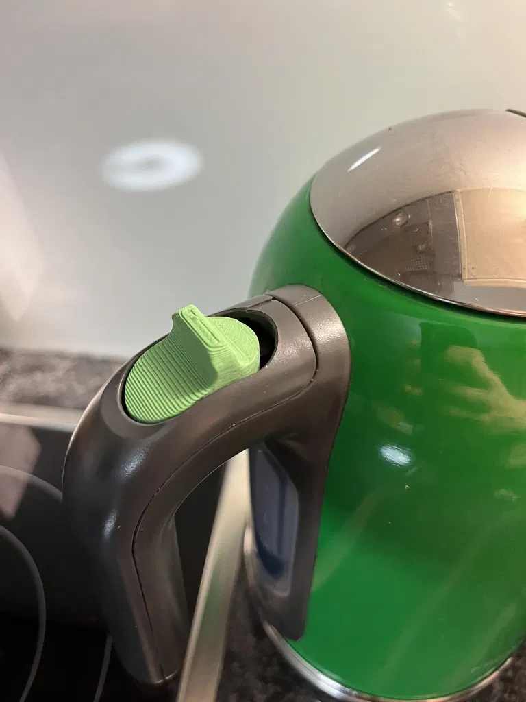 Mẫu chi tiết thay thế dạng drop-in cho cò/nút mở nắp của ấm Kenwood kMix Water Kettle (SJM020A). Giúp sửa nhanh nút bấm mở nắp bị hư mà không cần chỉnh sửa thêm.
