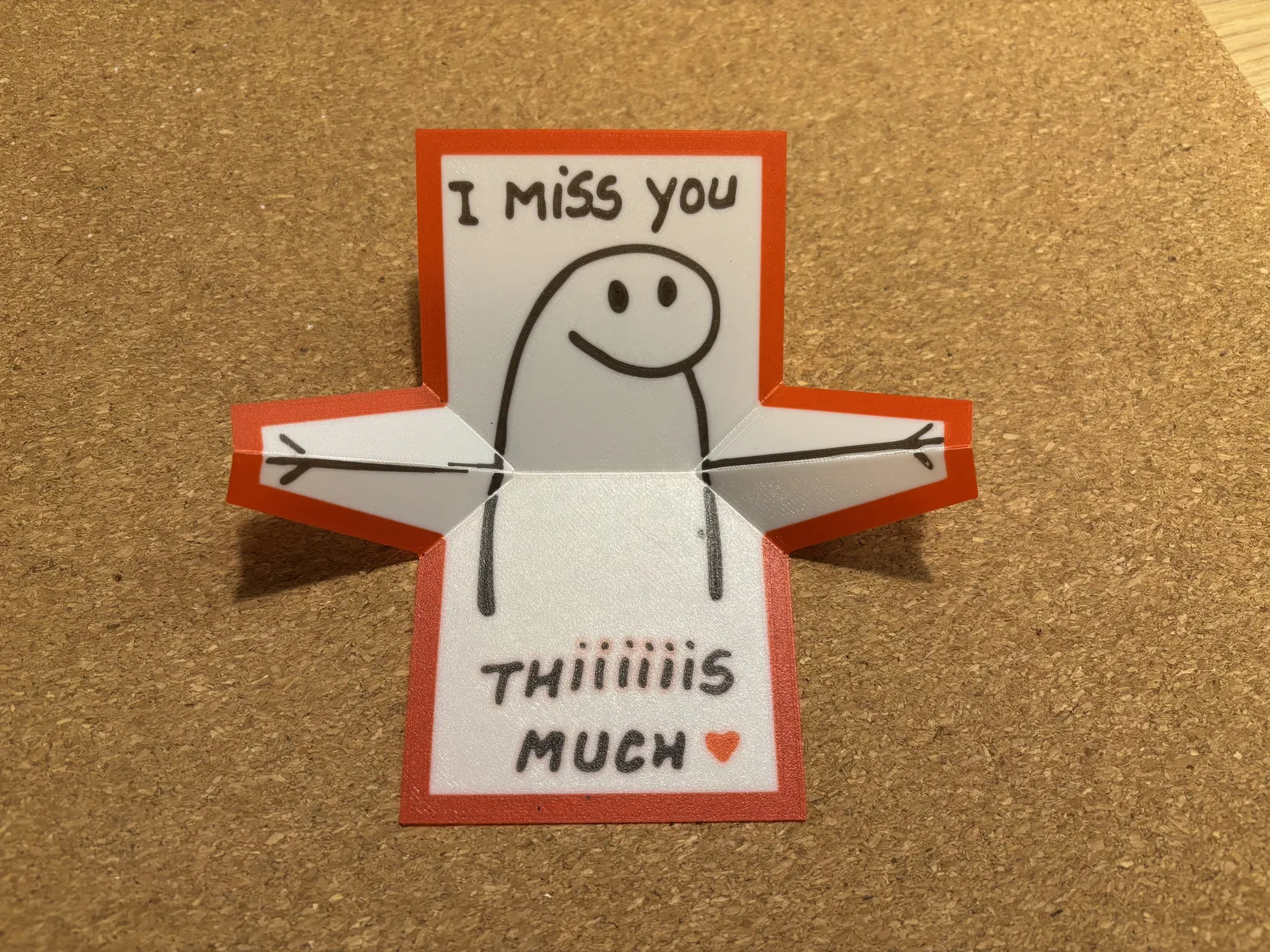 Thiệp pop-up ôm “I Miss You This Much” bản 3D in 3 màu, gấp phẳng và gấp lại sau khi in. Không cần MMU, chỉ đổi filament bằng "Single Extruder Multi Material" trong PrusaSlicer. In khoảng 30 phút, không cần supports.