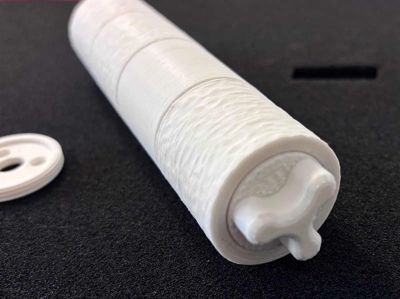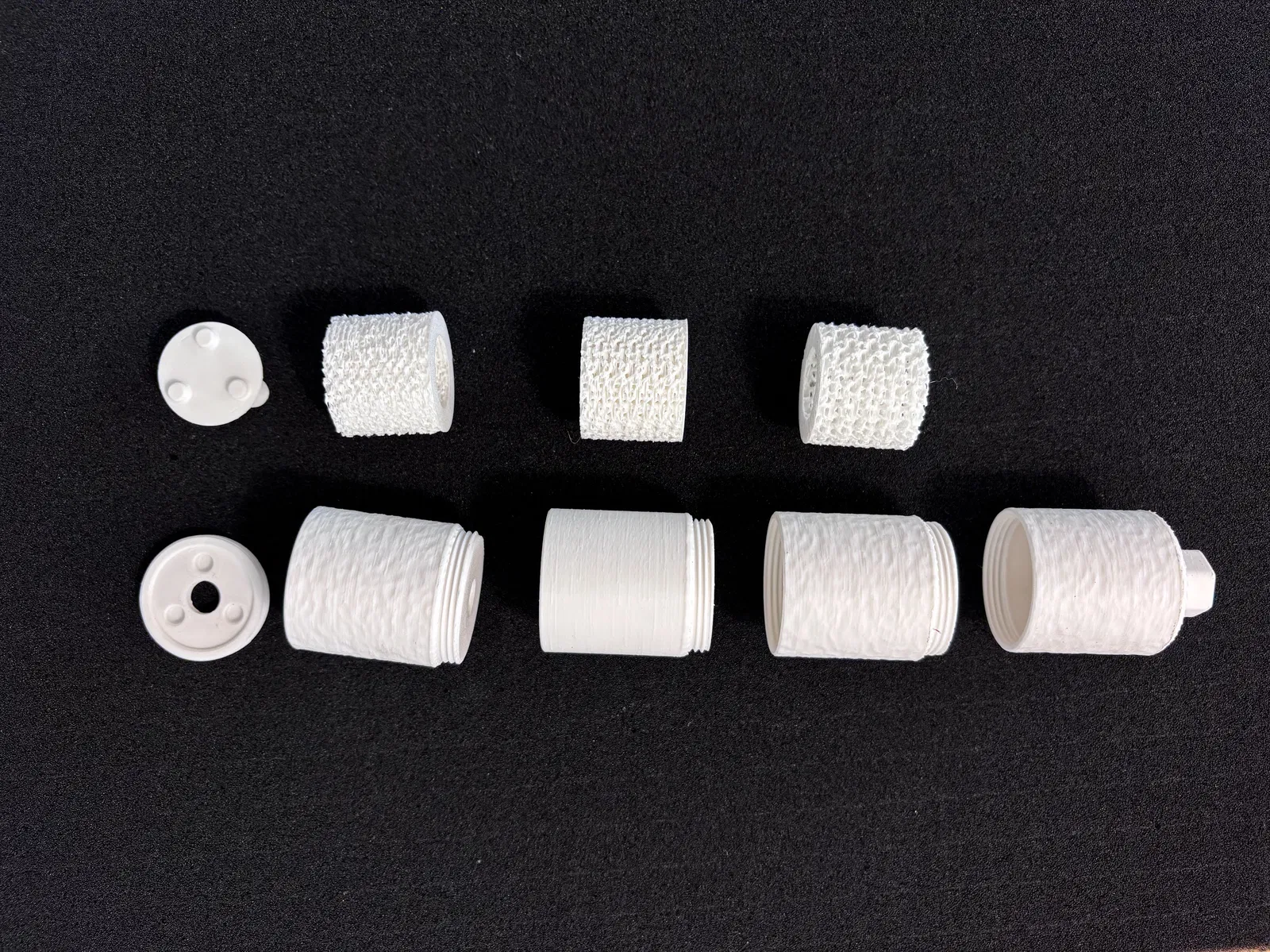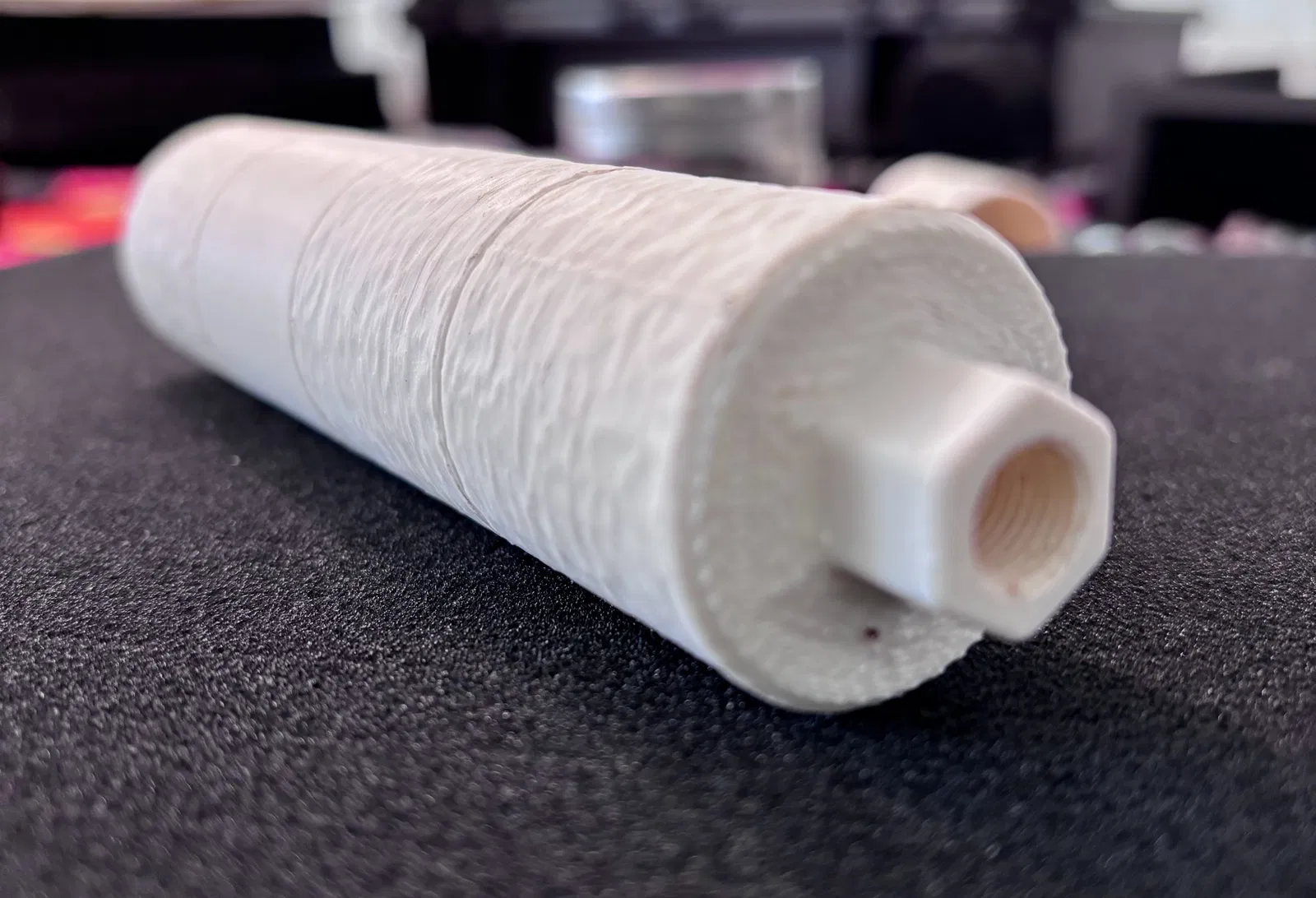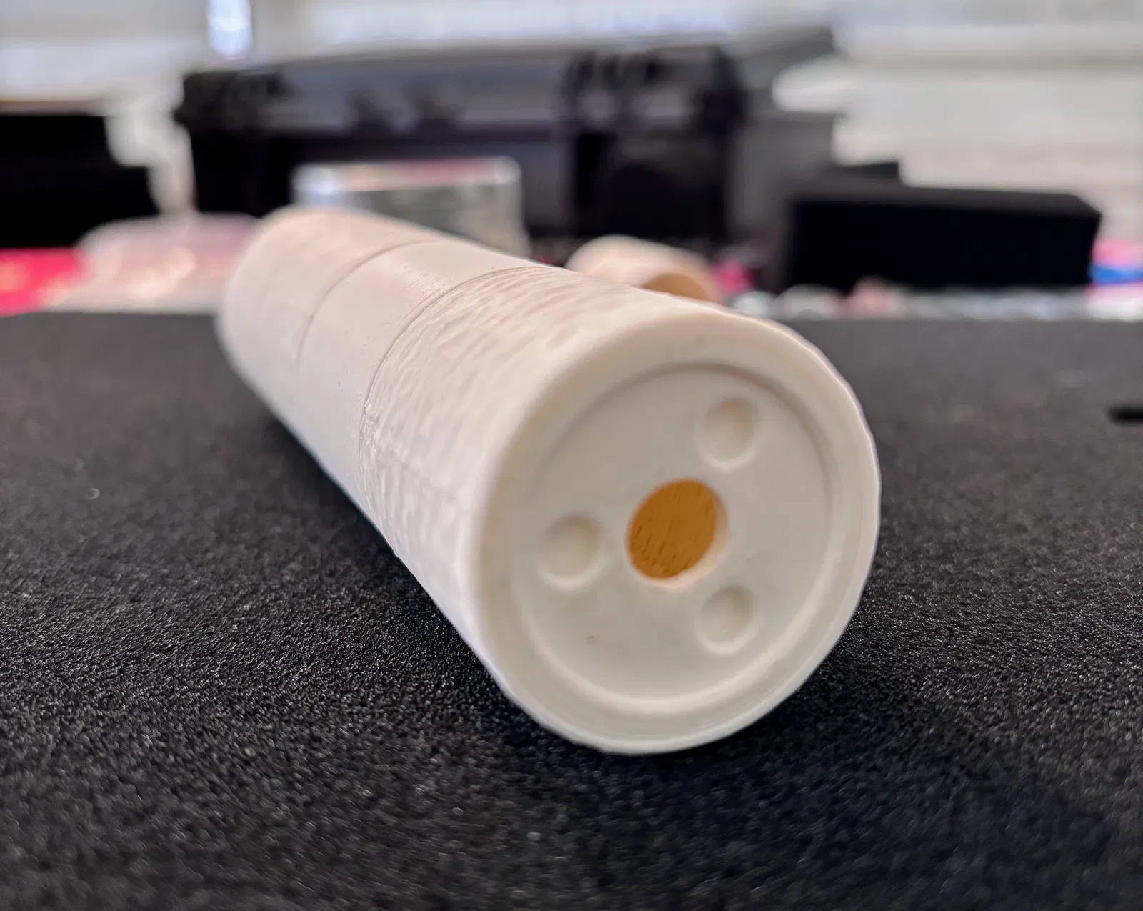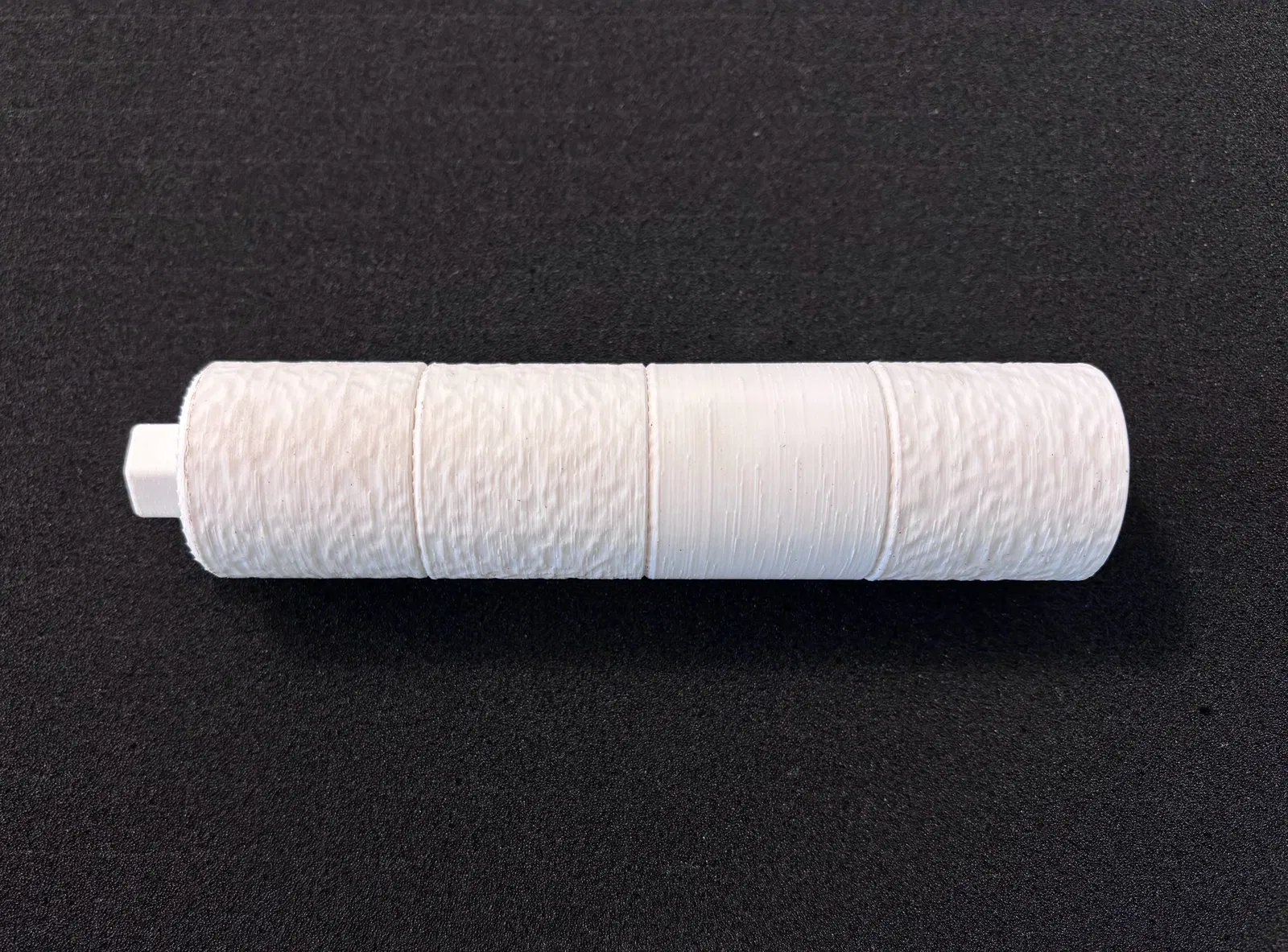 Các baffle tích hợp sẽ làm phần lớn việc giảm tiếng “gắt” của phát bắn. Thêm vật liệu dạng xốp/porous để làm chậm luồng khí thoát ra sẽ tăng hiệu quả. Mình đã thử đủ kiểu vật liệu, nhưng hiện tại thấy đơn giản nhất là in phần “sponge” với 0 walls và gyroid infill ở nhiều mật độ khác nhau để thử xem cái nào hợp nhất.