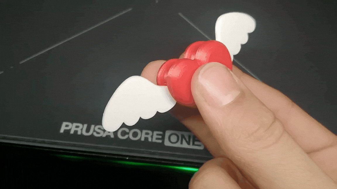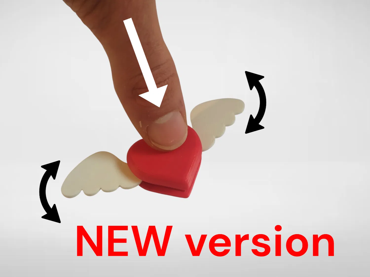 Mẫu trái tim khớp nối có cánh: bấm xuống là cánh vỗ. Phiên bản NEW cho biên độ chuyển động lớn hơn. In PLA không cần support, layer height 0.15 mm, viền 4 mm và khe hở 0.2 mm cho các chi tiết.