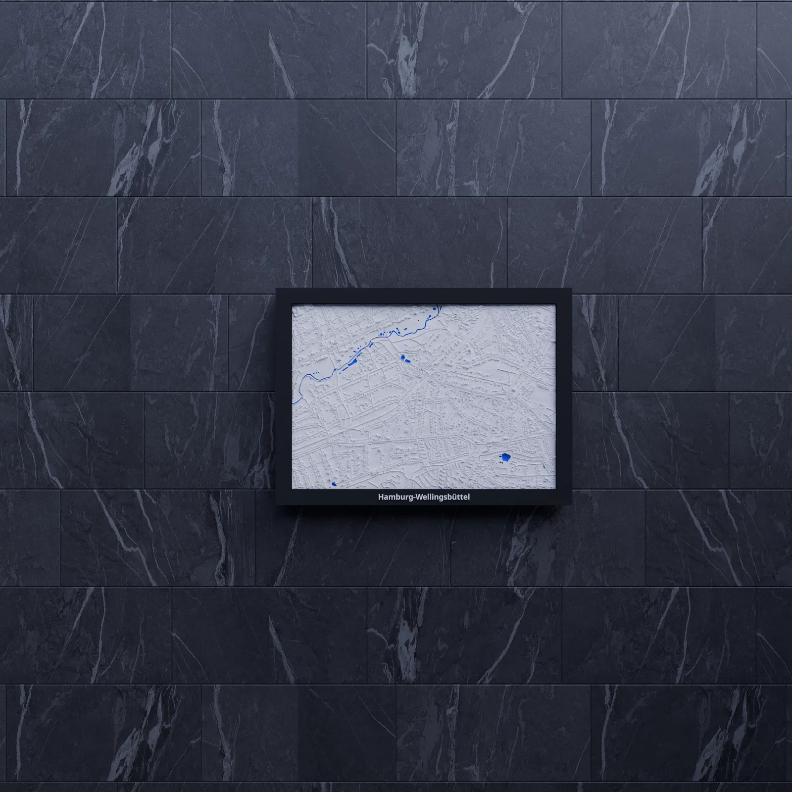 Bản thu nhỏ địa hình 3D của Hamburg-Wellingsbüttel (Đức), dựng từ dữ liệu địa lý để tái hiện terrain chân thực. Kích thước 170.5 × 119.5 mm, có frame và print profiles multicolor/single color.