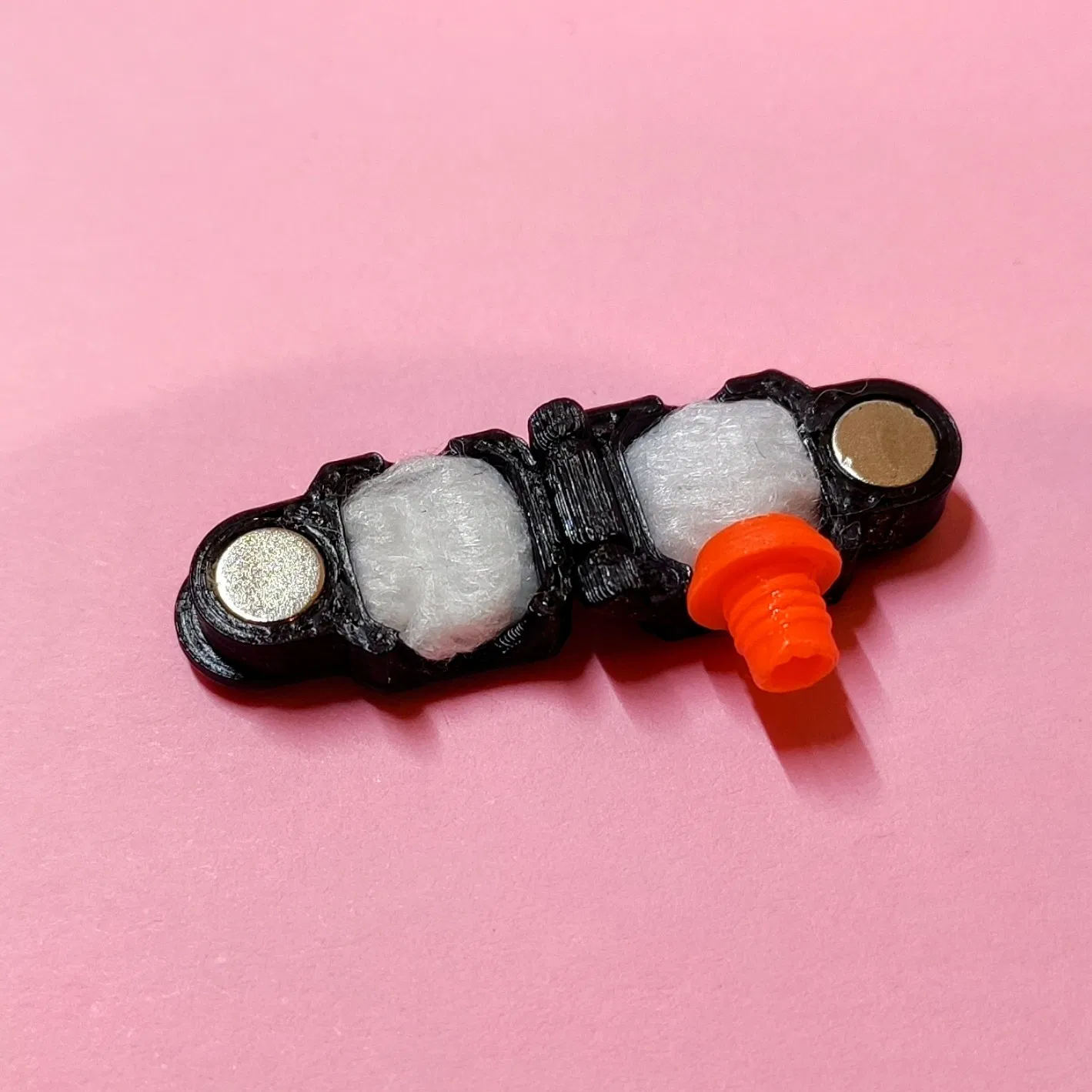 Bộ lọc gồm 2 phần và sẽ cần dán keo lại với nhau. Hãy in phần ren (thread) với layer 0.1mm. Phần vỏ (shell) có thể in với layer 0.2mm. Khi lắp ráp bạn sẽ cần 2 nam châm tròn 5x2mm (cao hơn cũng được) và một miếng vải để nhét vào cả hai nửa của vỏ. Về vật liệu vải, mình khuyến nghị dùng loại không dễ rách hoặc không rụng xơ. Ví dụ: một miếng gạc vô trùng. Tránh dùng bông gòn, vì có thể gây nghẹt nozzle.