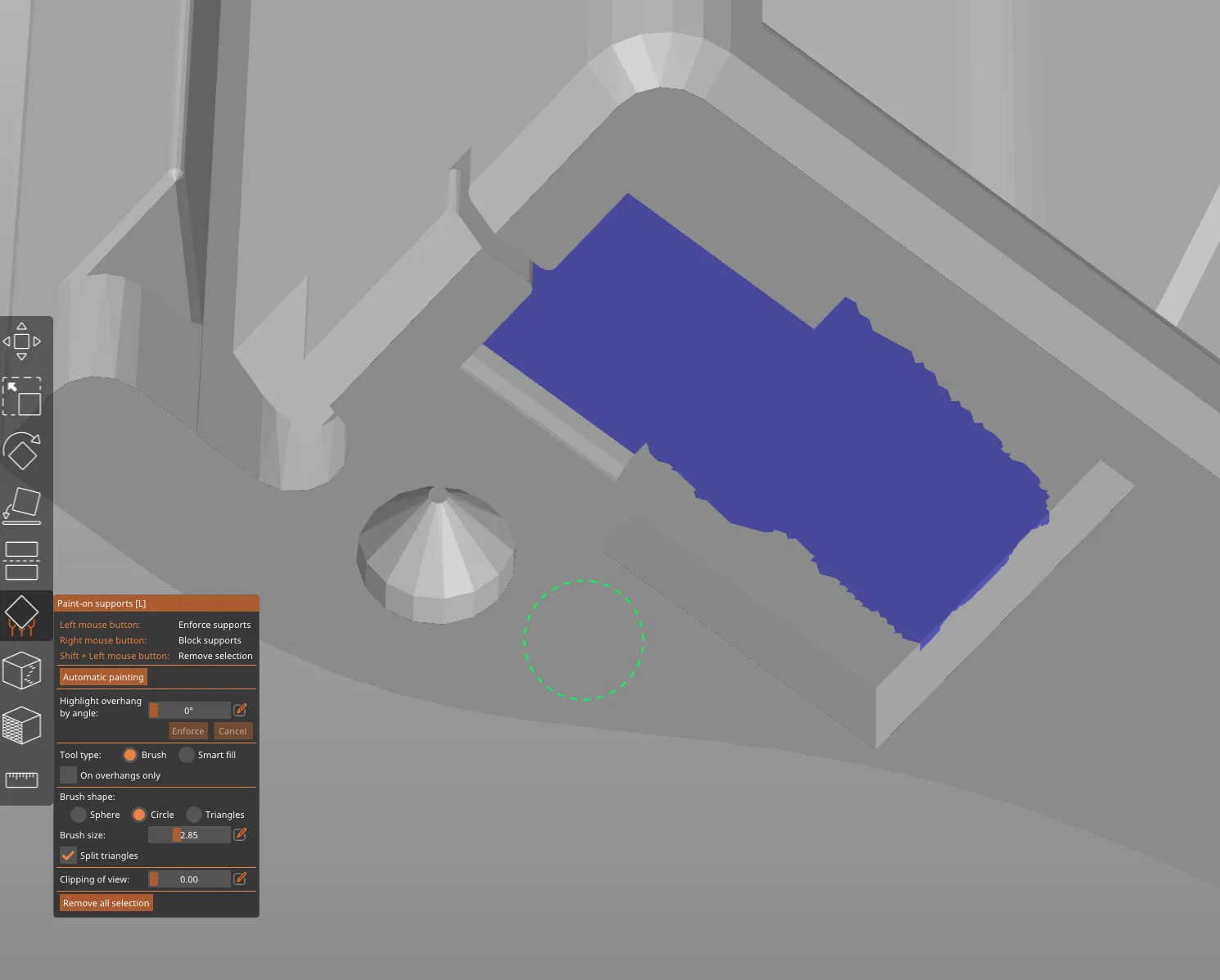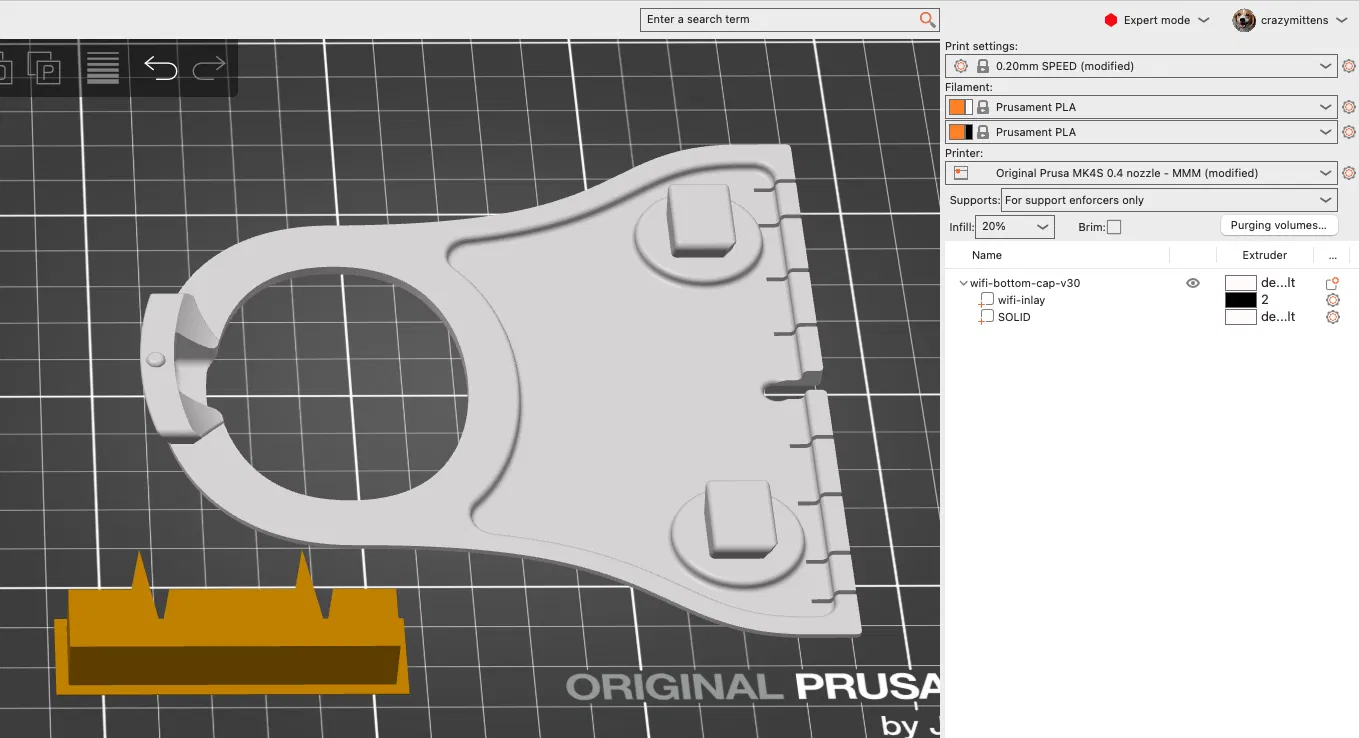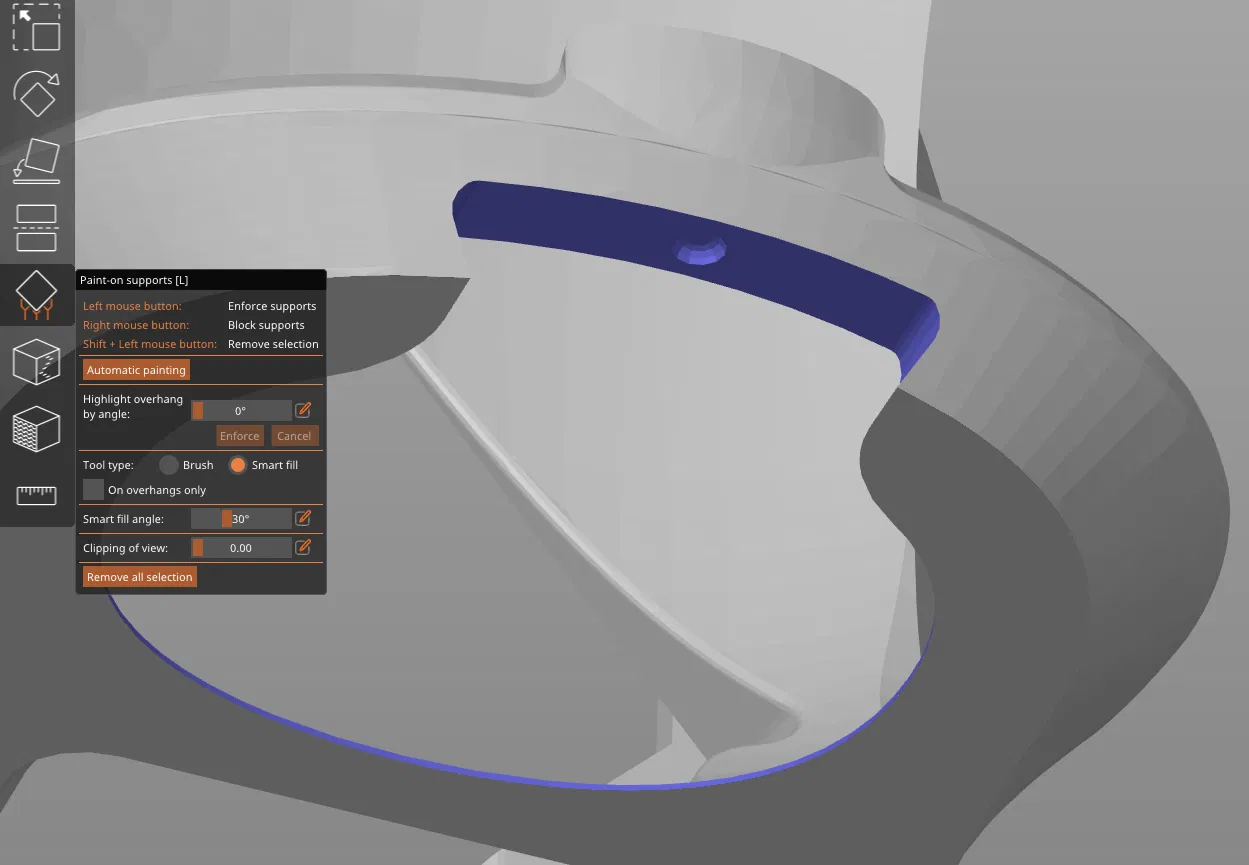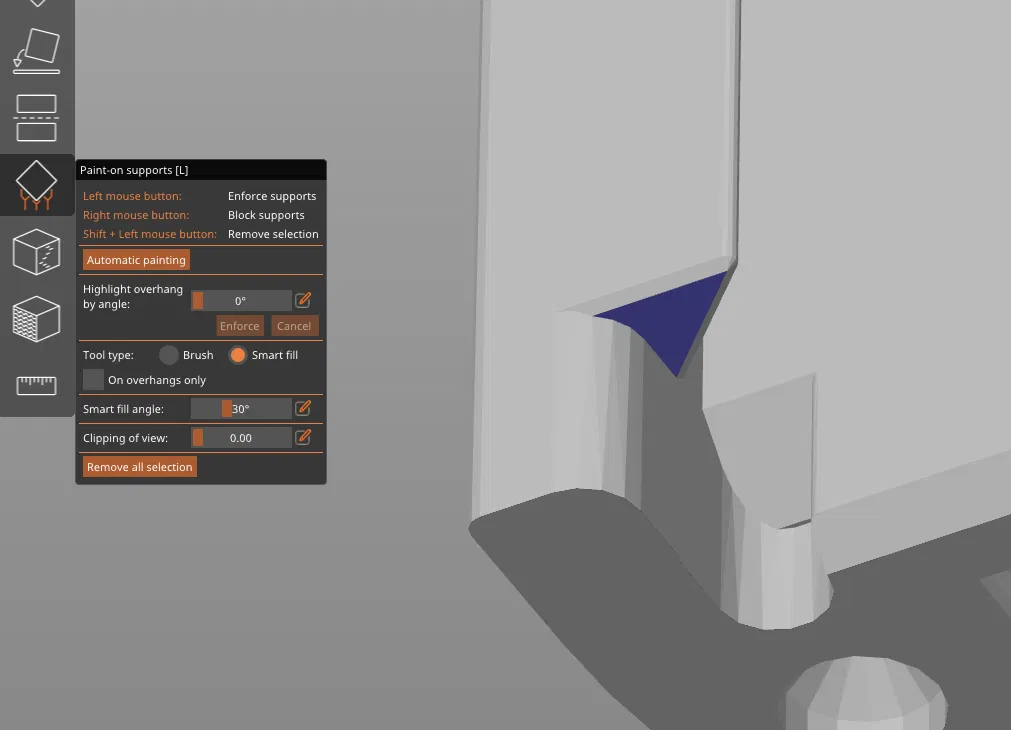 Xem hình để biết chỗ nào cần supports trên phần thân chính. Hai nắp trên/dưới, tay khóa (locking handle), và wall plate thì hoàn toàn không cần supports.