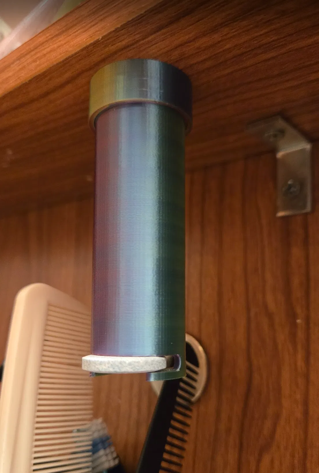 Hộp nhả viên nhỏ gắn dưới kệ, dùng cho viên làm sạch retainer Brite. Giúp lấy viên dễ hơn và tránh quên vứt vỏ gói. Vài tuần cắt gói, nạp vào hộp rồi vặn ống vào phần trên đã gắn.