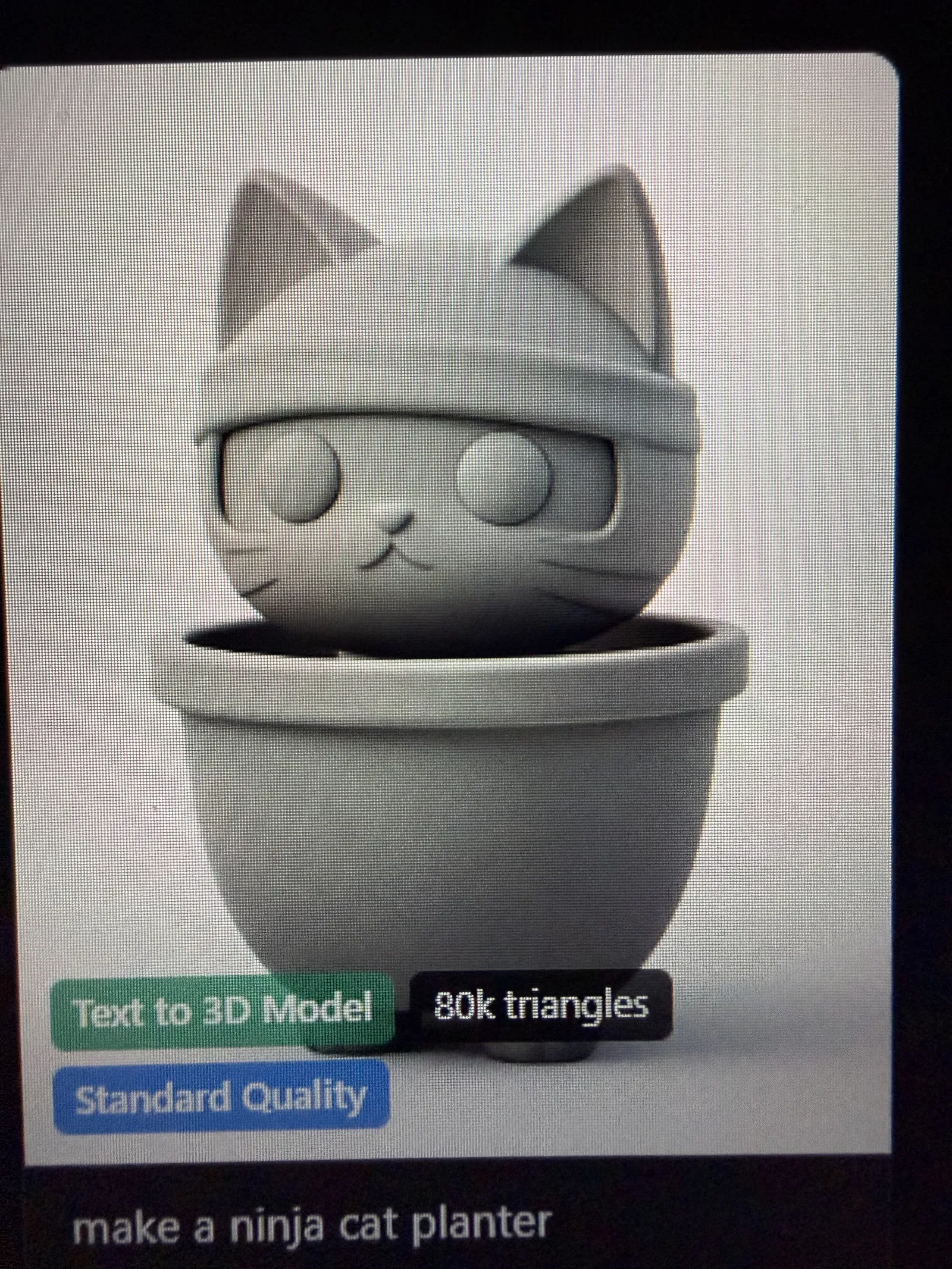 Một mẫu 3D vui nhộn và hơi “dị” theo kiểu dễ thương: chú mèo ninja ngồi trong một cái chậu. Tác giả làm ra để có một ý tưởng mới lạ, không đụng hàng với những mẫu phổ biến.