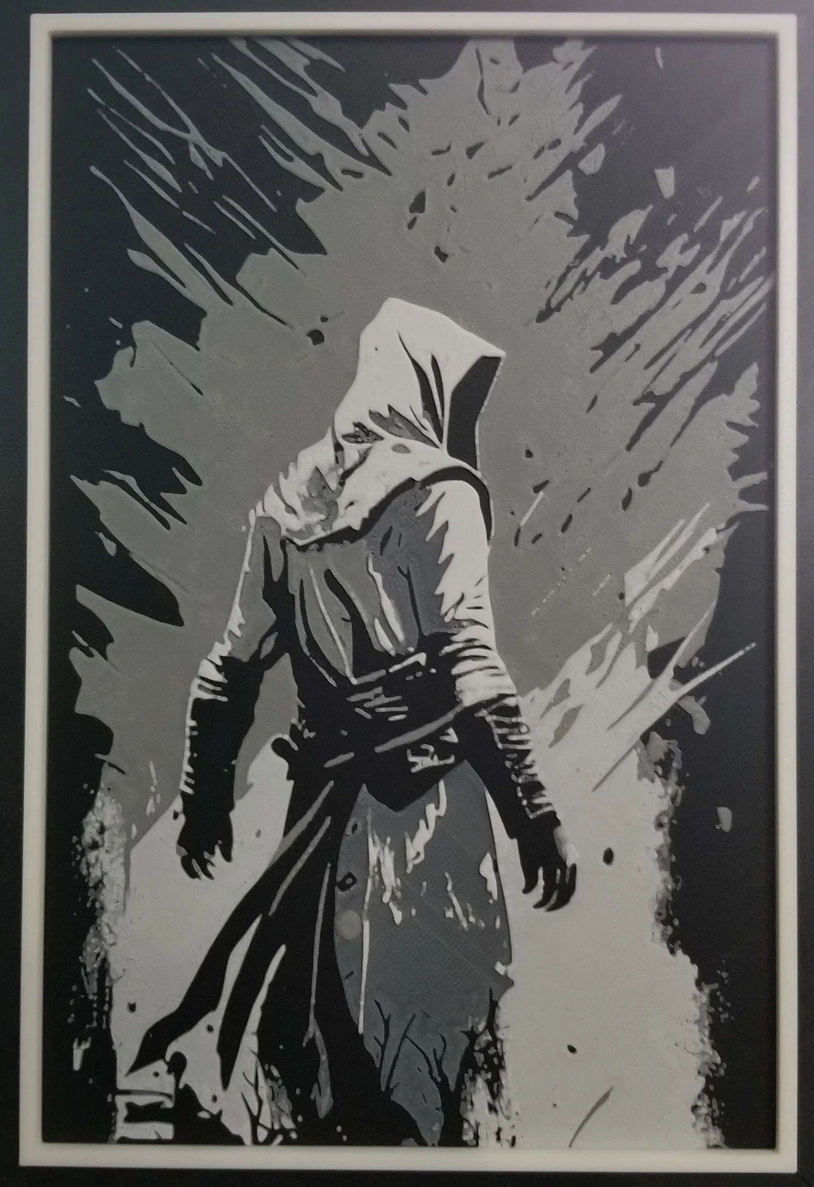 Mẫu Hueforge Assassin Creed kích thước 133.4x200mm. In PLA với 100% infill, layer height 0.08mm (base 0.16mm). Hướng dẫn swap màu Black → Gray → White theo layer, kèm tùy chọn màu viền.