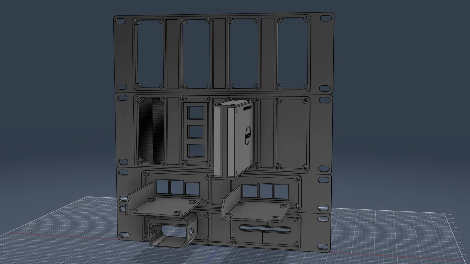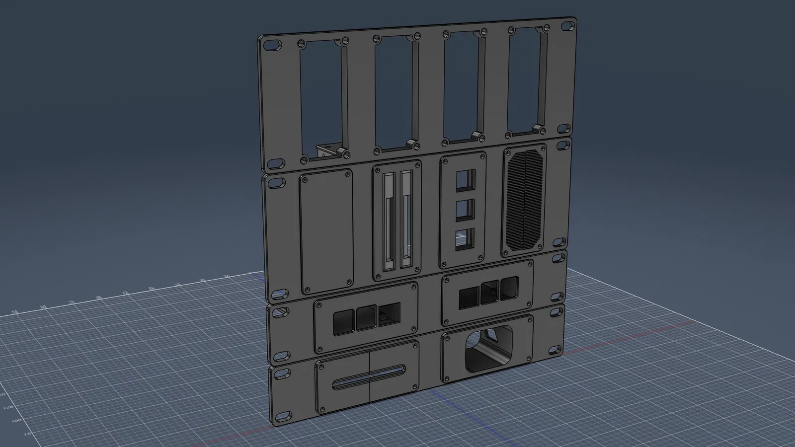 Có carrier frame bản 1U và 2U. Frame 1U chứa 2 plate theo chiều ngang, còn frame 2U chứa 4 plate theo chiều dọc. Mỗi kích thước có 2 phiên bản: bản recessed và bản flat mount (không cần supports). Tất cả đều thiết kế để dùng M3 heat set inserts. Plate được bắt vào frame bằng vít M3x8 hoặc M3x10.