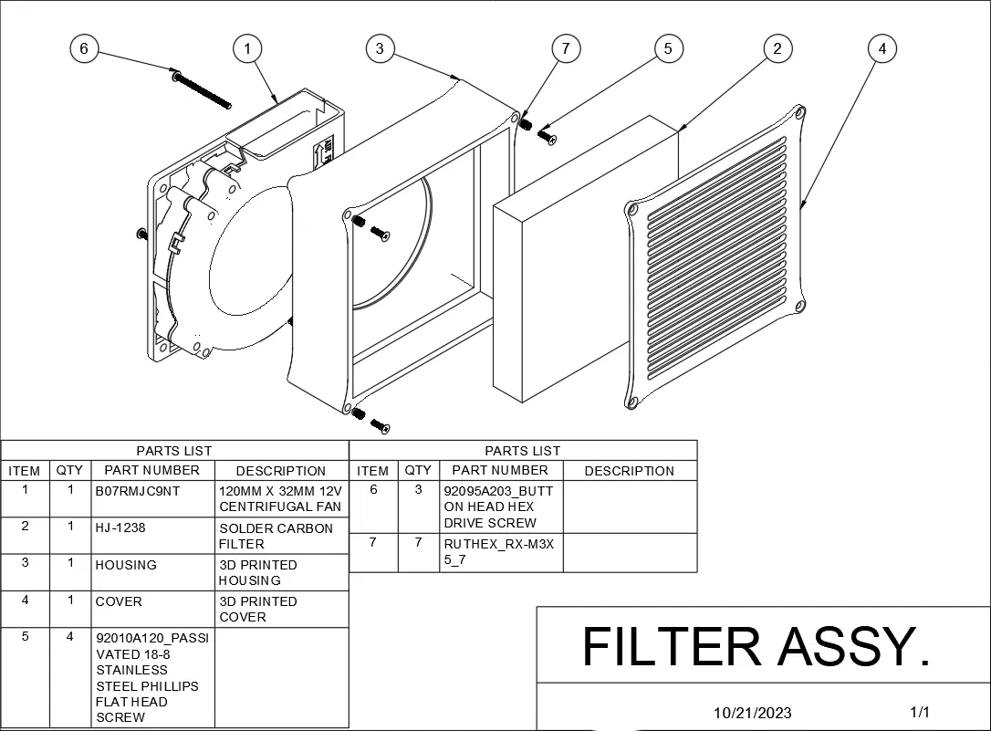 CF120B là bộ lọc carbon dùng cho in 3D, hàn (soldering), v.v. Thiết kế cần thread inserts; xem BOM trong bản vẽ lắp ráp. Lưu ý: chưa có chứng nhận, dùng thiết bị lọc tự làm là tự chịu rủi ro.