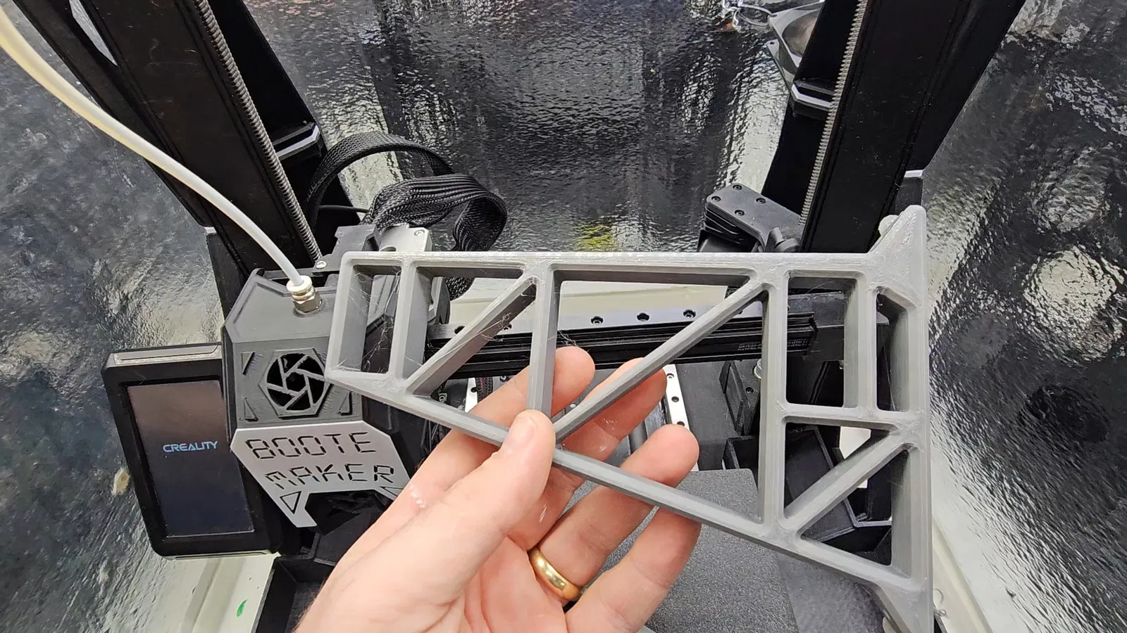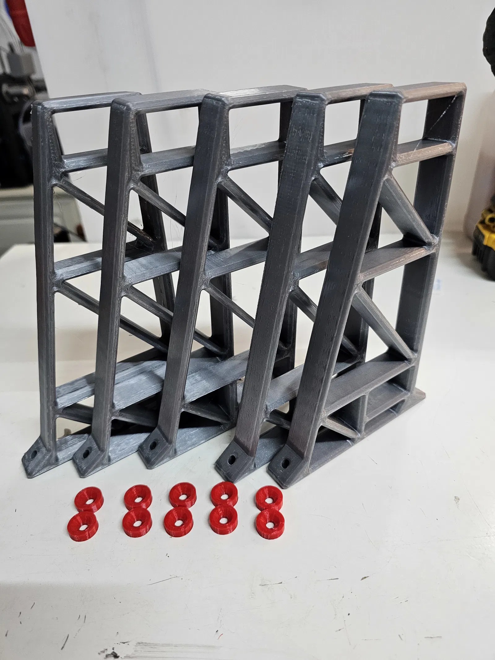 Mình dùng PETG với 5 walls và 100% infill. Mình dùng long đền chìm (countersunk washers) để tránh mấy vít construction screws làm tách lớp (splitting layers).