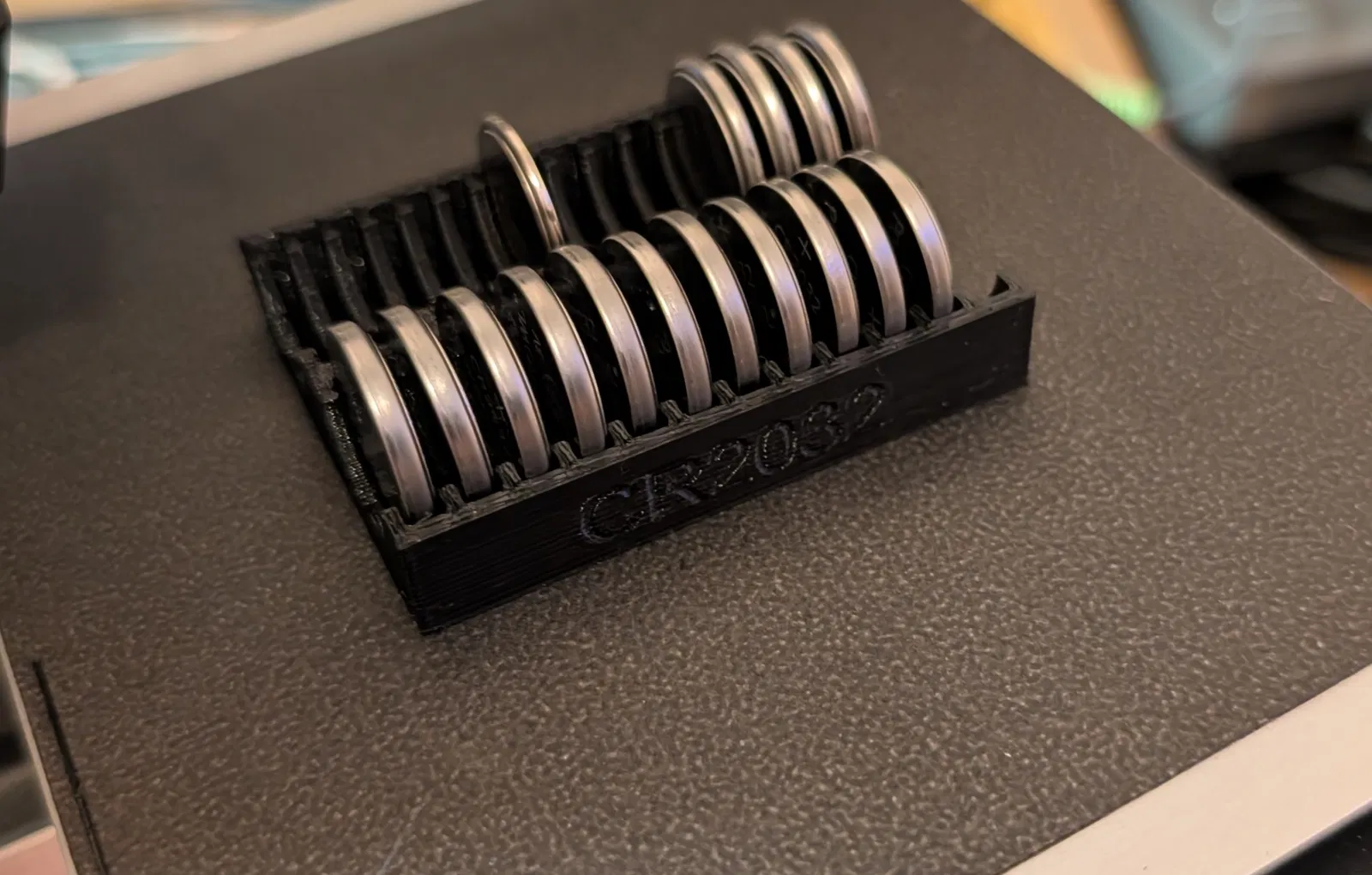 Mình có một vỉ pin CR2032 dạng phẳng chiếm chỗ trên bàn làm việc, thêm vài viên pin coin rời khác nữa, nên cuối cùng cũng quyết định sắp xếp lại cho gọn. Vì không ưng đa số các thiết kế khay/giá đựng pin CR có sẵn (vì nhiều lý do khác nhau), mình quyết định tự thiết kế cái của riêng mình. Dung sai (tolerances) không quá sít nên bạn có thể in với vật liệu và thiết lập tùy ý, tuy nhiên mình khuyên dùng brim nếu in bằng PLA.