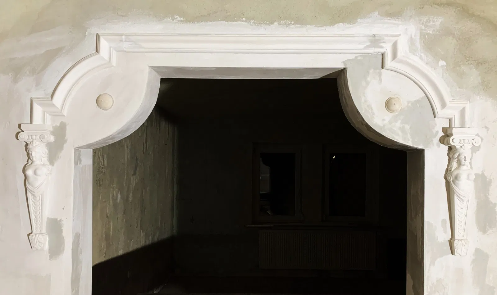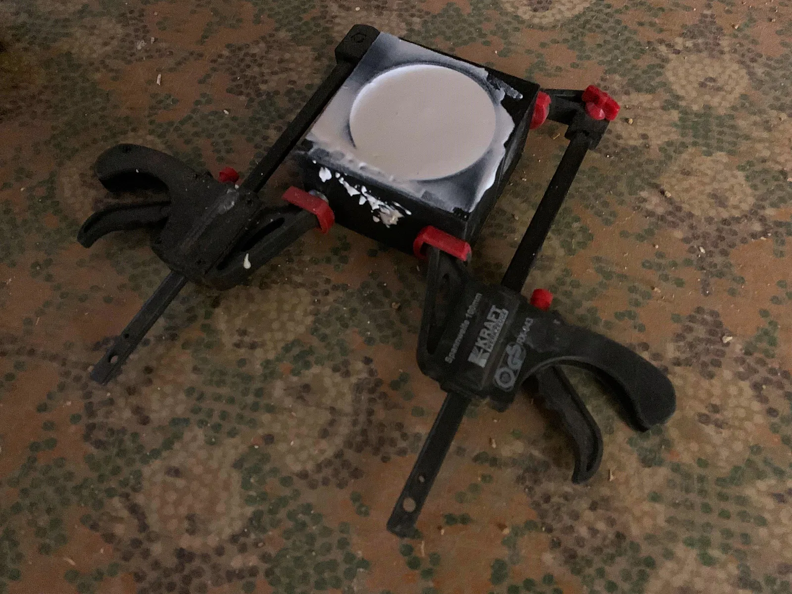Trong lúc mình gắn stucco cho ô cửa chuyền đồ tương lai giữa bếp và phòng ăn, mình để ý ở hai góc trát bo tròn (xem hình) bị thiếu hai chi tiết nhỏ. Vì vậy mình làm một khuôn đúc dựa theo dạng “nút/knob” hình bán cầu—kiểu hay thấy trên mặt tiền nhà hoặc đồ nội thất thời Gründerzeit. Khuôn gồm 2 nửa để dễ lấy phần thạch cao đã đông ra khỏi khuôn. Hai nửa khuôn được liên kết bằng 2 ty ren M6 và đai ốc cánh (wing nuts); ngoài ra có thể dùng vít M6 hoặc luồn thanh 6 mm xuyên qua. Cũng có thể dùng kẹp (giống trong hình) để ép chặt hai nửa khuôn lại.