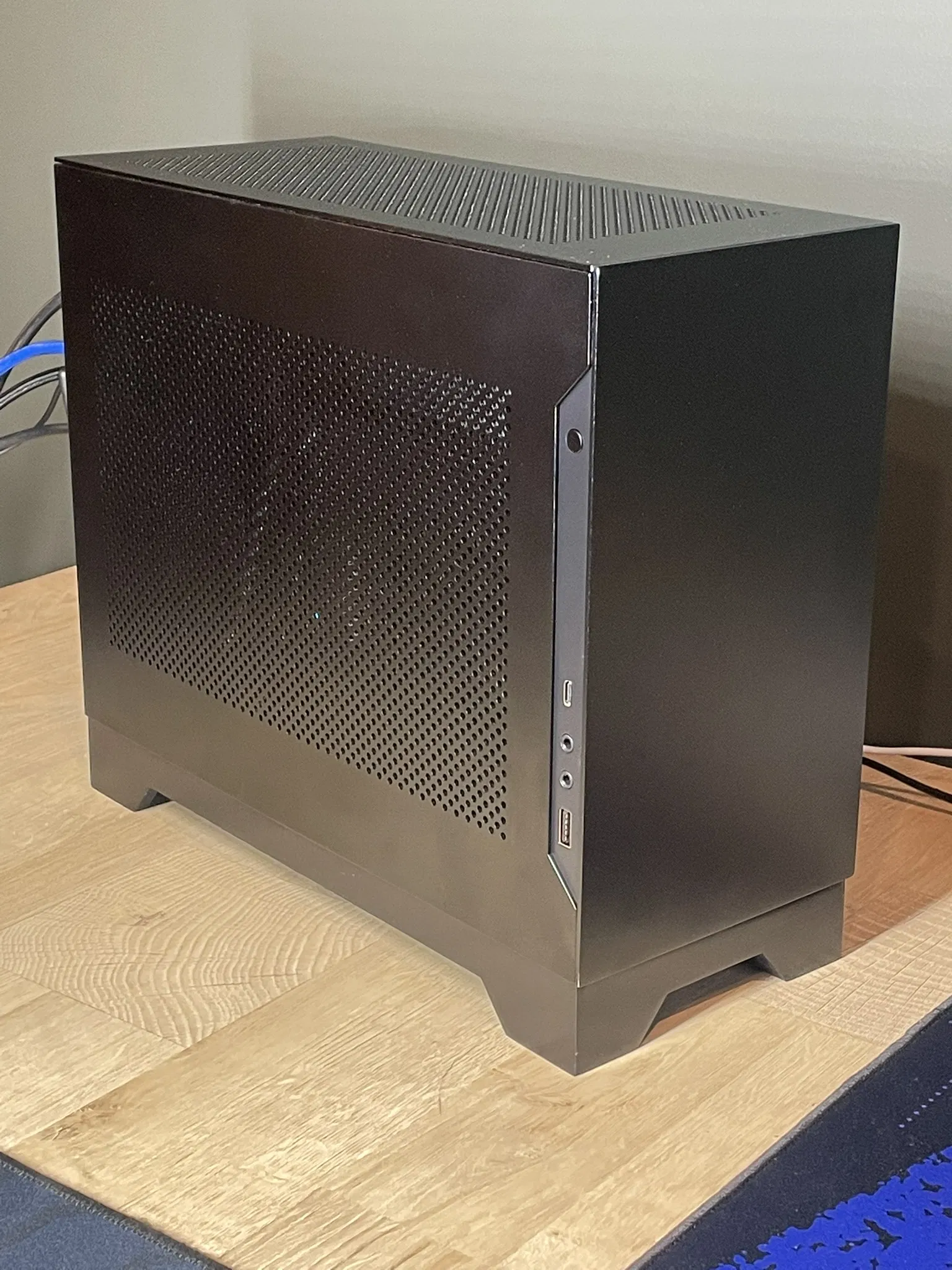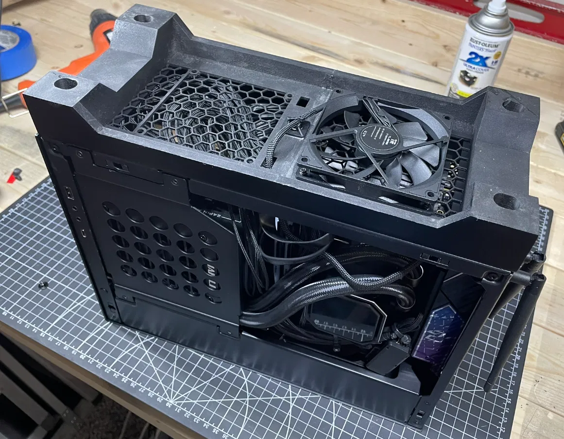 Riser/shroud giúp cải thiện airflow và gắn thêm 2 quạt slim 92mm ở đáy Lian Li A4-H20. Lỗ đáy ~92mm nên không cần quạt lớn hơn. Lưu ý dây PSU tránh ép vào grilles để không cạ cánh quạt.