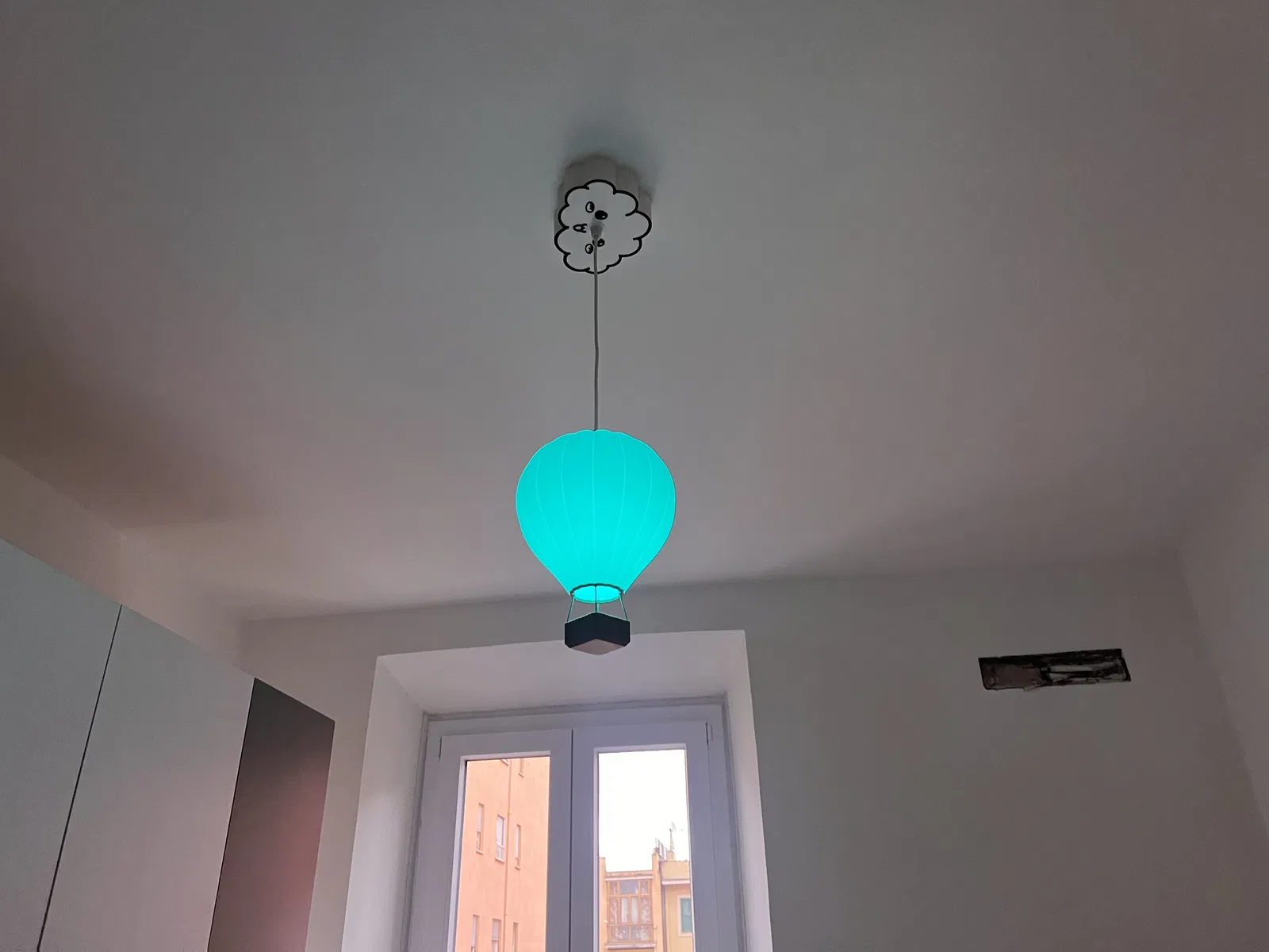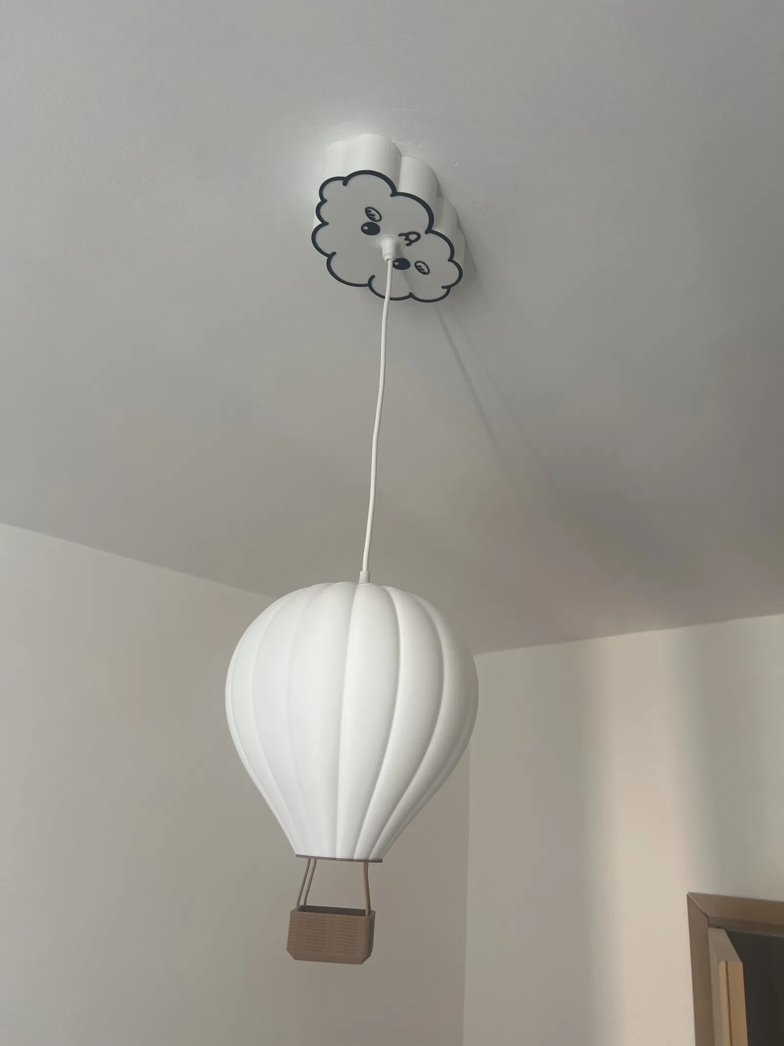 Mẫu đèn trần hình khinh khí cầu “mềm” thiết kế từ đầu, tối ưu cho bàn in tối thiểu 250×250 mm. Lắp multipart, chỉ cần keo ở giỏ, dây và vòng nối. Hỗ trợ bóng e27 bề ngang tối đa 70mm.
