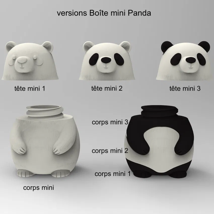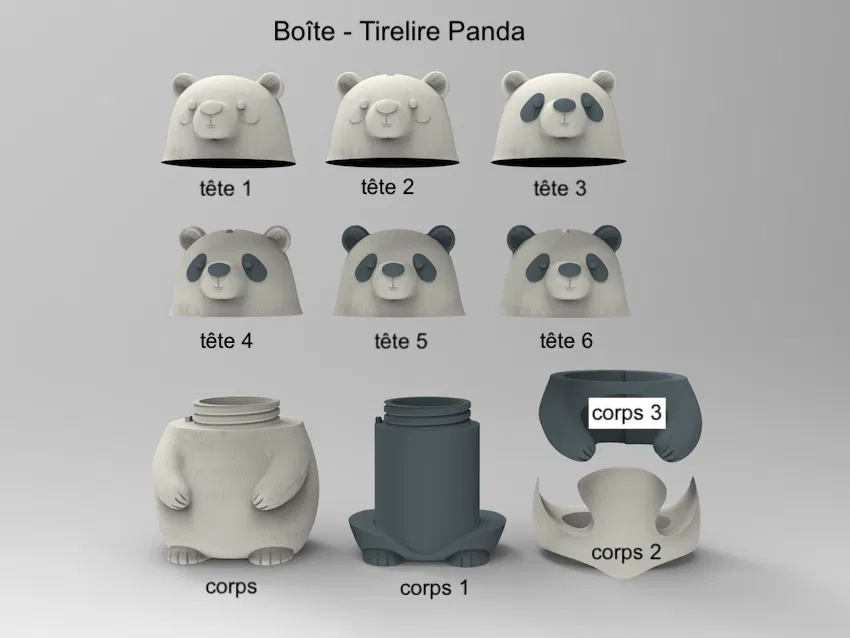 Mẫu Boîte-Tirelire Panda là hộp/ống heo hình gấu trúc, có nhiều phiên bản. Kích thước bản thường 76×76×100mm, bản mini 45,6×45,6×60mm. Thiết lập gợi ý: resolution 0,20, infill 33%, cần support cho corps 2.stl và corps mini 2.stl.