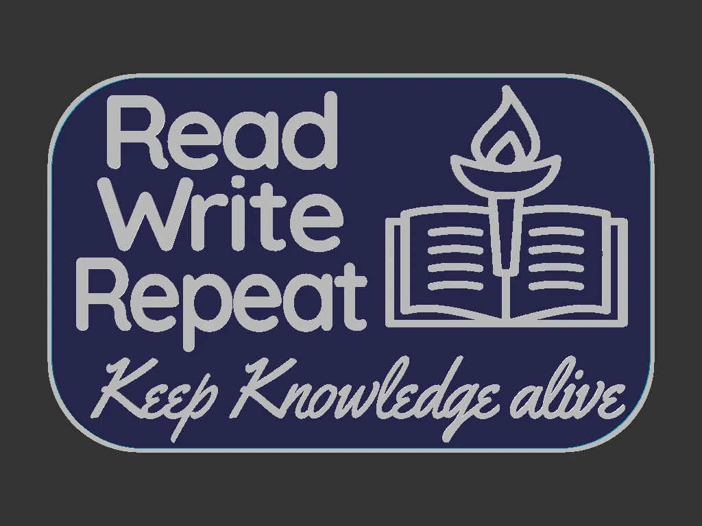 Bảng treo 100x160mm với hình sách và đuốc, kèm chữ “Read Write Repeat: Keep Knowledge alive”. Có file Mesh và Solid; khuyến nghị đổi màu (color switch) trên 1mm, có gcode mẫu.