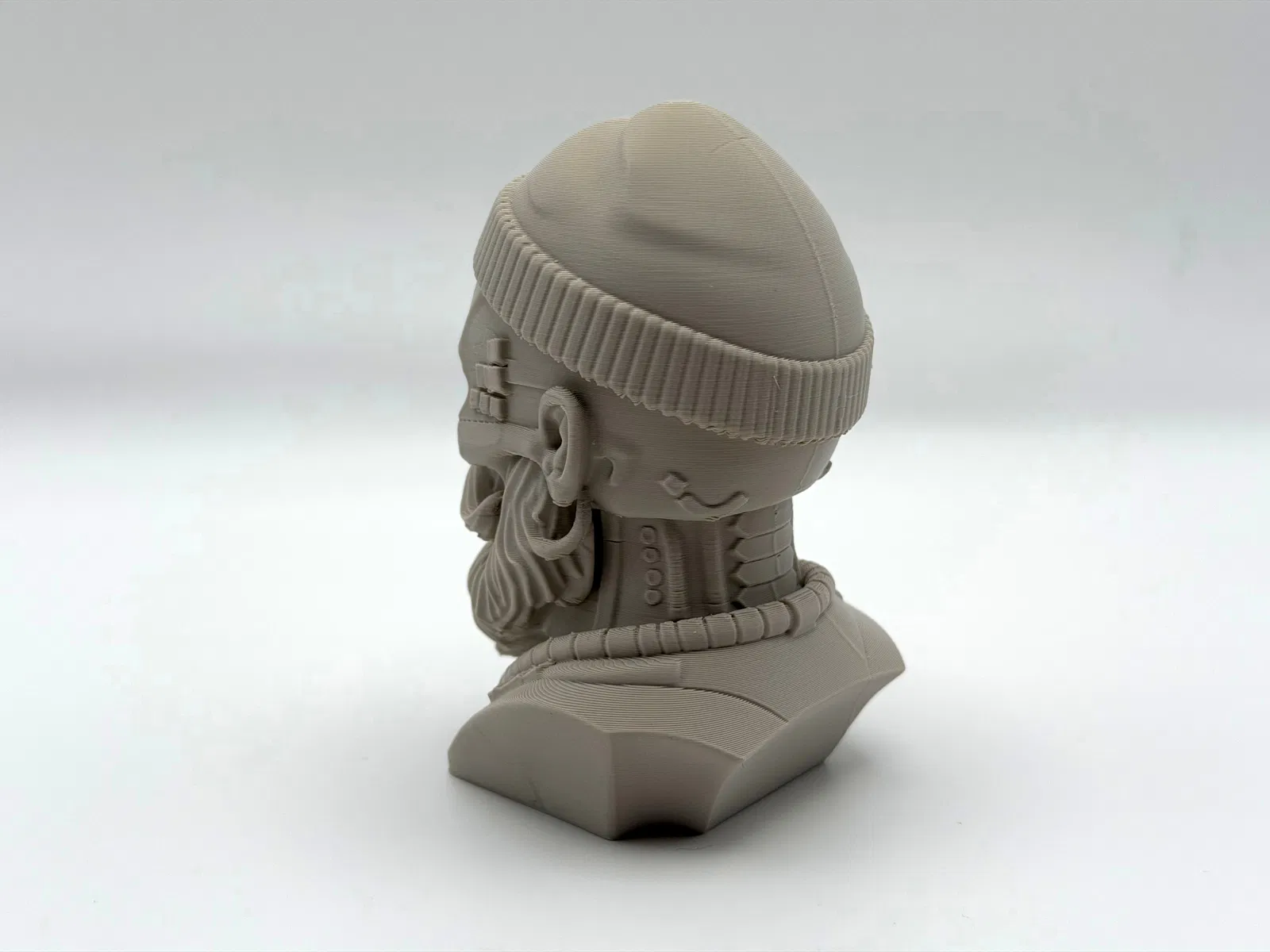 Cyberpunk Beanie Skull là tượng bust trang trí in 3D, kết hợp vibe đường phố “bụi” với phong cách tương lai. Cần supports; organic-style supports dễ gỡ, chỉnh Z-top height giúp tháo supports nhẹ hơn.