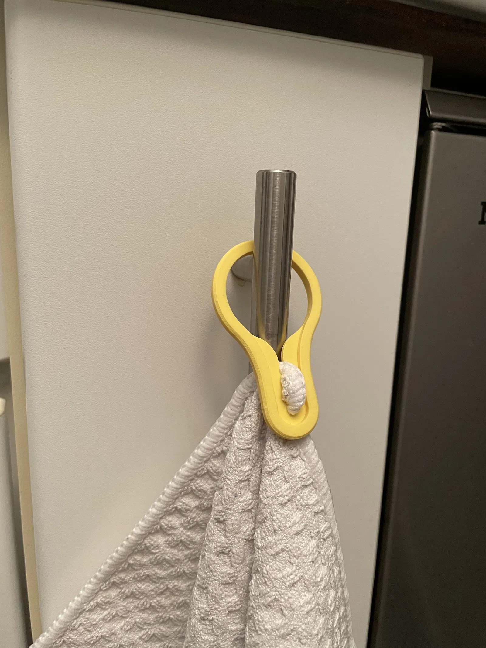 Theo kinh nghiệm của mình thì mấy cái vòng treo khăn (towel loop) hay bị đứt, hoặc nhỏ quá, hoặc khó tìm. Cái móc treo này hợp với mọi loại khăn, từ khăn bếp tới khăn tắm, và đủ lớn để móc được với hầu như mọi loại móc treo.