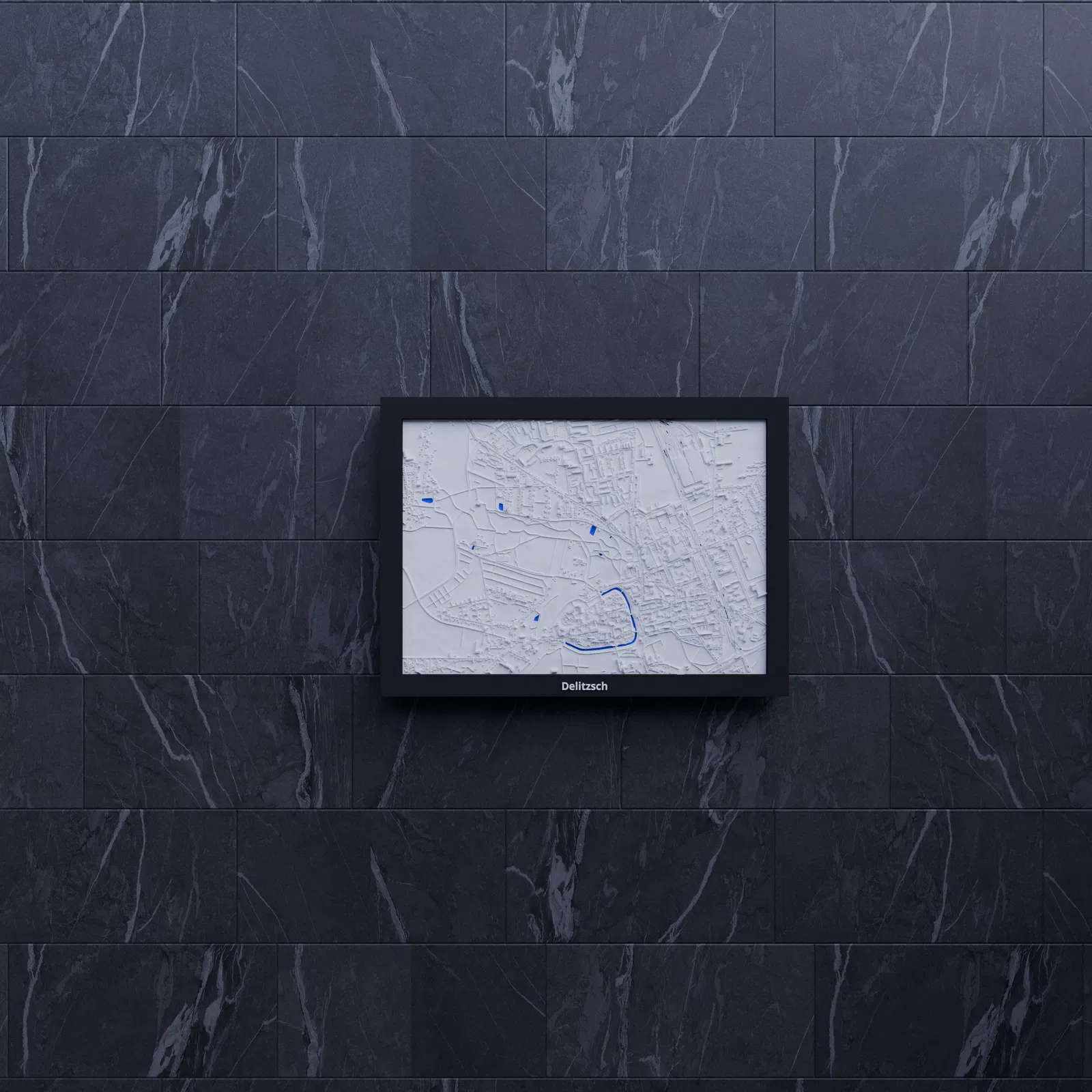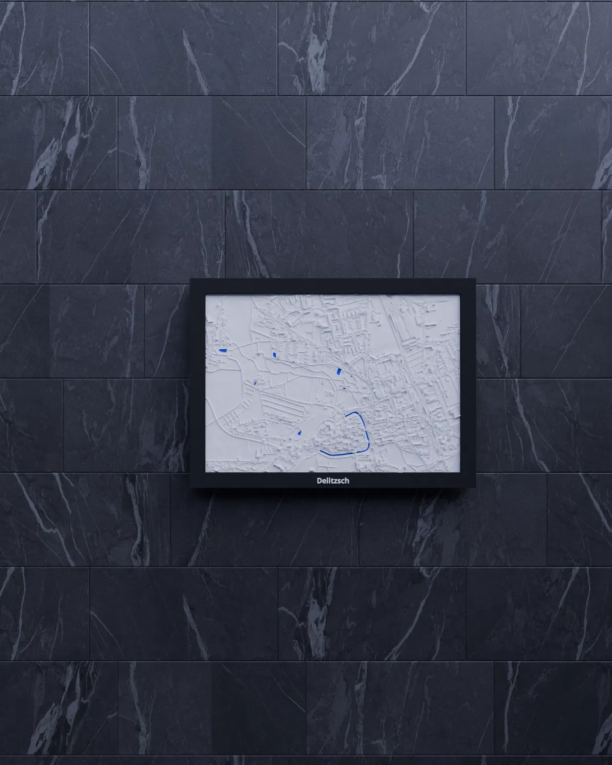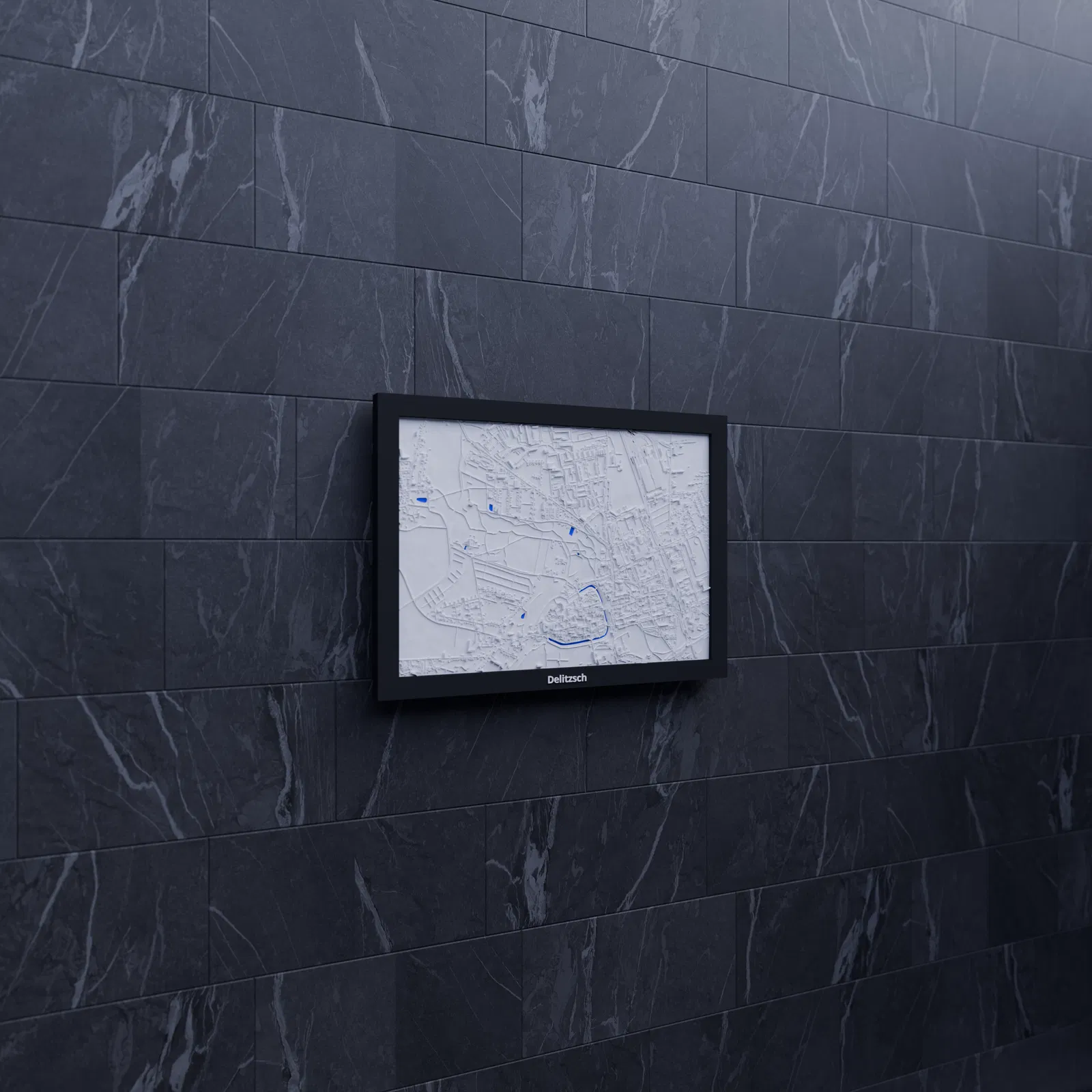 Mô hình địa hình thu nhỏ Delitzsch (Đức) tái hiện terrain và khu đô thị từ dữ liệu địa lý, tỉ lệ ~16535:1. Kèm nhiều frame có/không khắc chữ, phù hợp in PLA, trưng bày hoặc làm quà tặng.