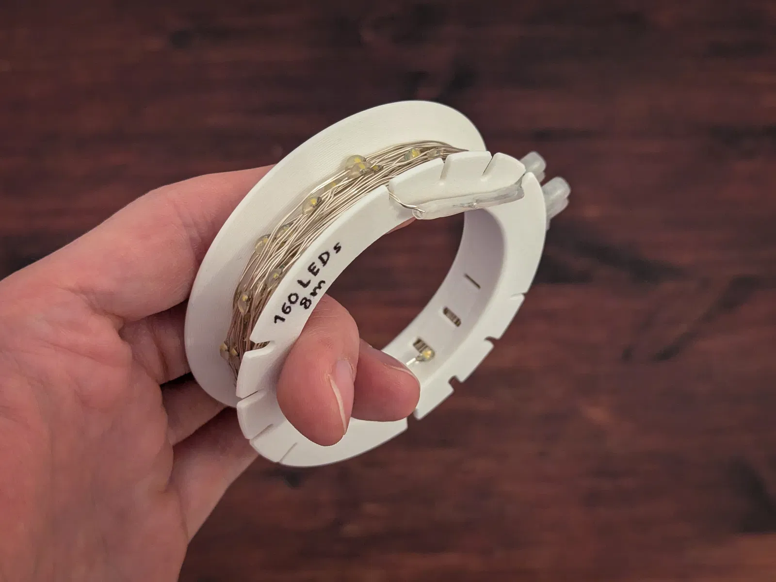 Cuộn dây đơn giản này giúp bạn quấn và tháo các dây đèn fairy lights mảnh một cách gọn gàng, không bị rối hay làm hư dây. Hai đầu dây đèn có thể cố định bằng các lỗ với nhiều kích cỡ khác nhau, giữ mọi thứ ngăn nắp và dễ cất.